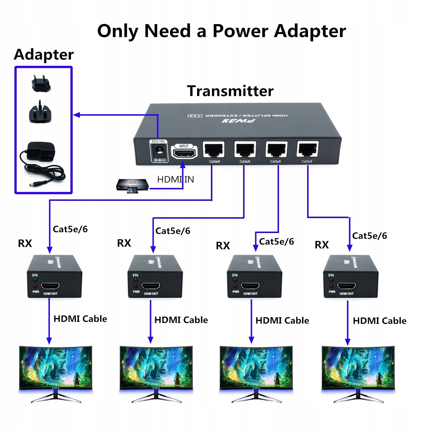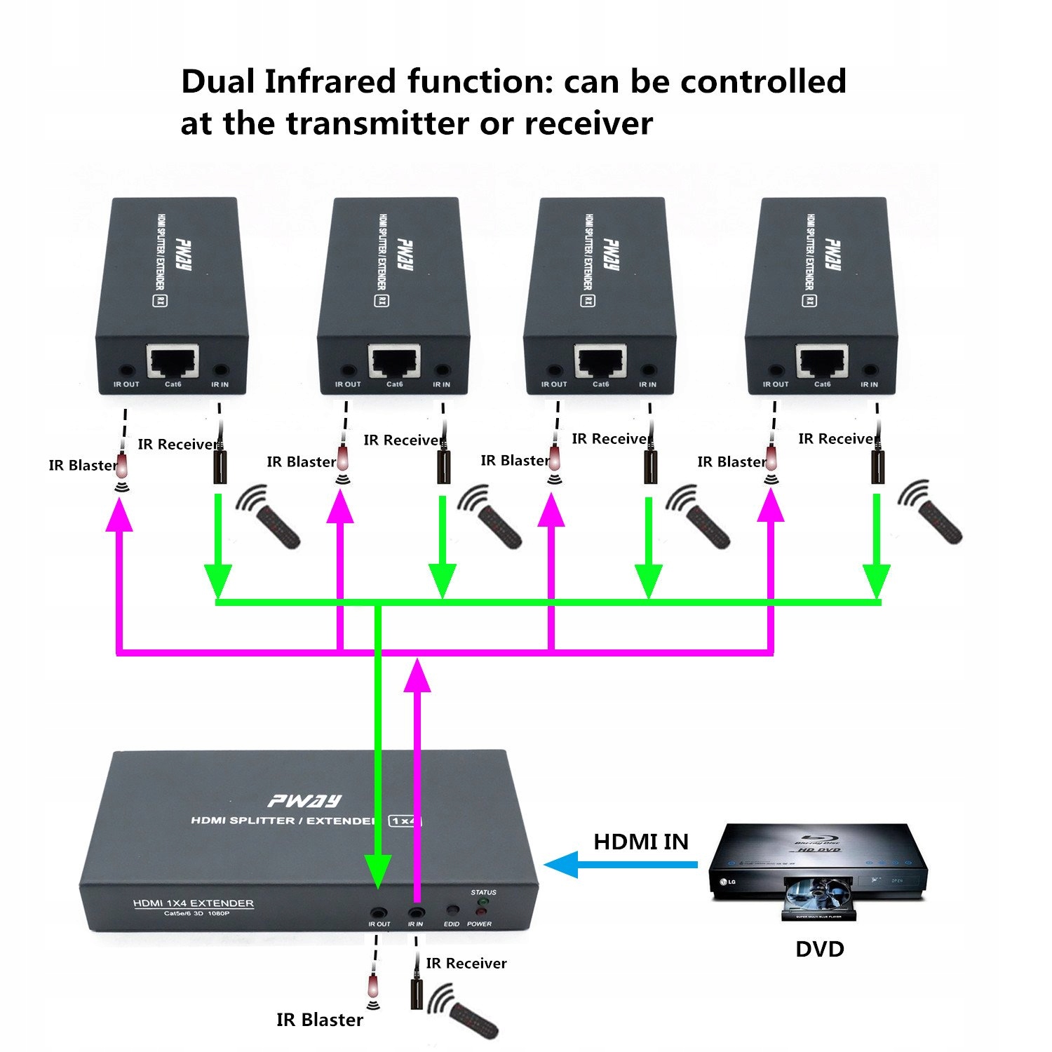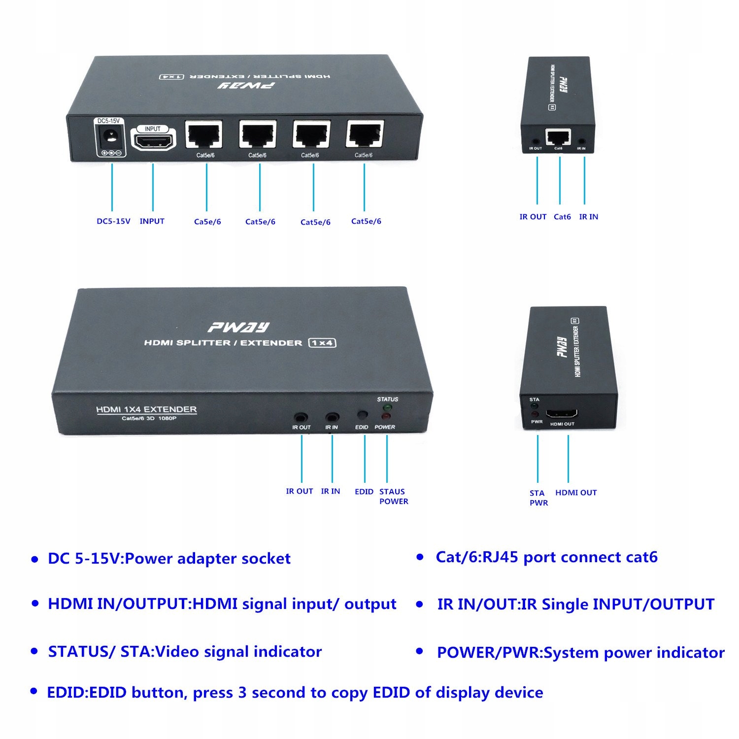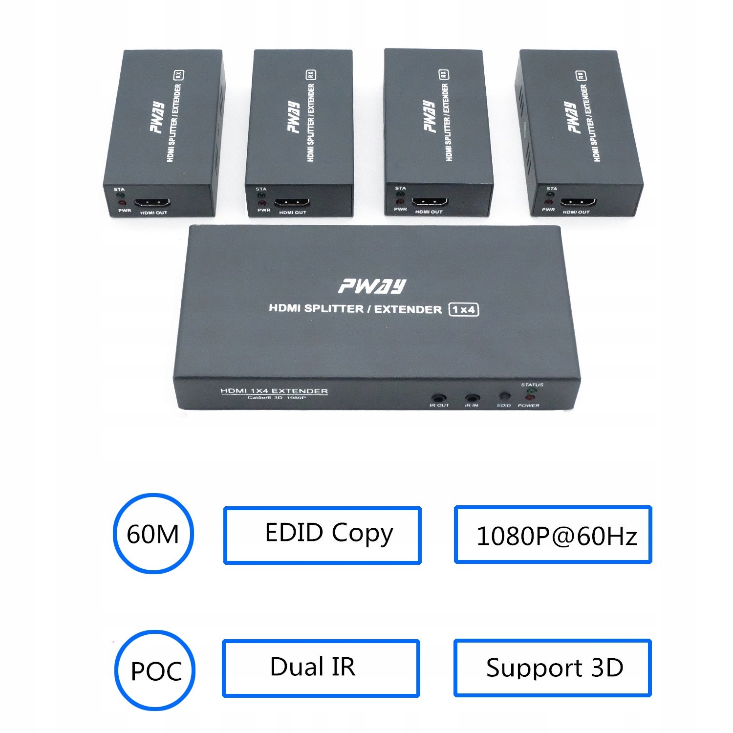розширення розподілу PW-HTS0104IR після введення пристрою джерела сигналу HDMI можна розділити на чотири мережеві кабелі для трансляції відстані до 60 метрів. Він також підтримує функцію навчання EDID та функцію інфрачервоної передачі, яка може адаптуватися до різних складних додатків. Пристрій має відмінні параметри обробки та передачі зображень, завдяки якому розподіл сигналу плавніший і стабільний.