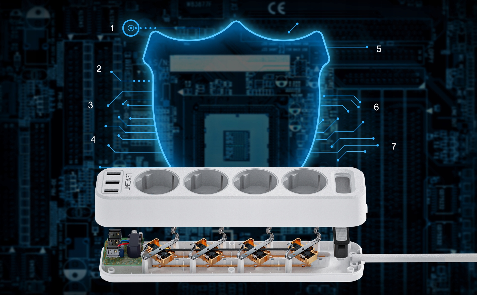 Подовжувач LENCENT WP09-F4b-3U, 7 розеток, 1,5 м, білий