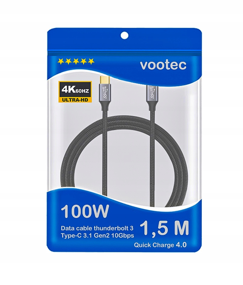 Високоякісний подовжувач vootec USB-C 3.1 Gen2 Thunderbolt 3 використовується для швидкої зарядки 100 Вт 5 А, передачі даних зі швидкістю до 10 ГБ/с та передає АУДІО/ВІДЕОсигнал у високій якості 4K 60 Гц.