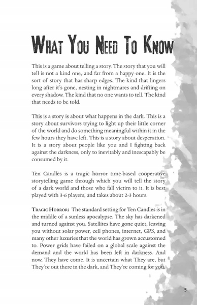 Десять свічок - це трагічна рольова гра в рольова гра, що підірвана навколо спільного розповіді. Він розроблений для одноразових сеансів (а не поточних кампаній) і його можна грати з будь-якою кількістю гравців та одним ігровим майстром. Гра з десяти свічок триває 2-3 години. Гравці беруть на себе ролі вцілілих посеред безсоткового апокаліпсису, живучи останні кілька годин життя свого персонажа. Gamemaster контролює їх, небезпечних супротивників, які переслідують трохи за межі світла. Але це не історія про монстрів. Це історія про те, що щасливо в темряві. Що відбувається з тими, хто бореться проти цього, шукає надію всередині нього, і неминуче споживається цим.