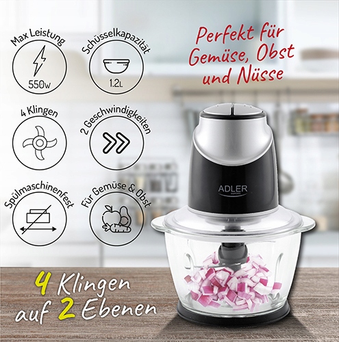 Елегантний і міцний подрібнювач із лезами з нержавіючої сталі є корисним кухонним приладом. Дозволяє подрібнювати різні види продуктів. Скляна чаша об’ємом 1,2 л міцна і легко миється. Чоппер AD4082 може працювати в звичайному або імпульсному режимі, залежно від потреб користувача.