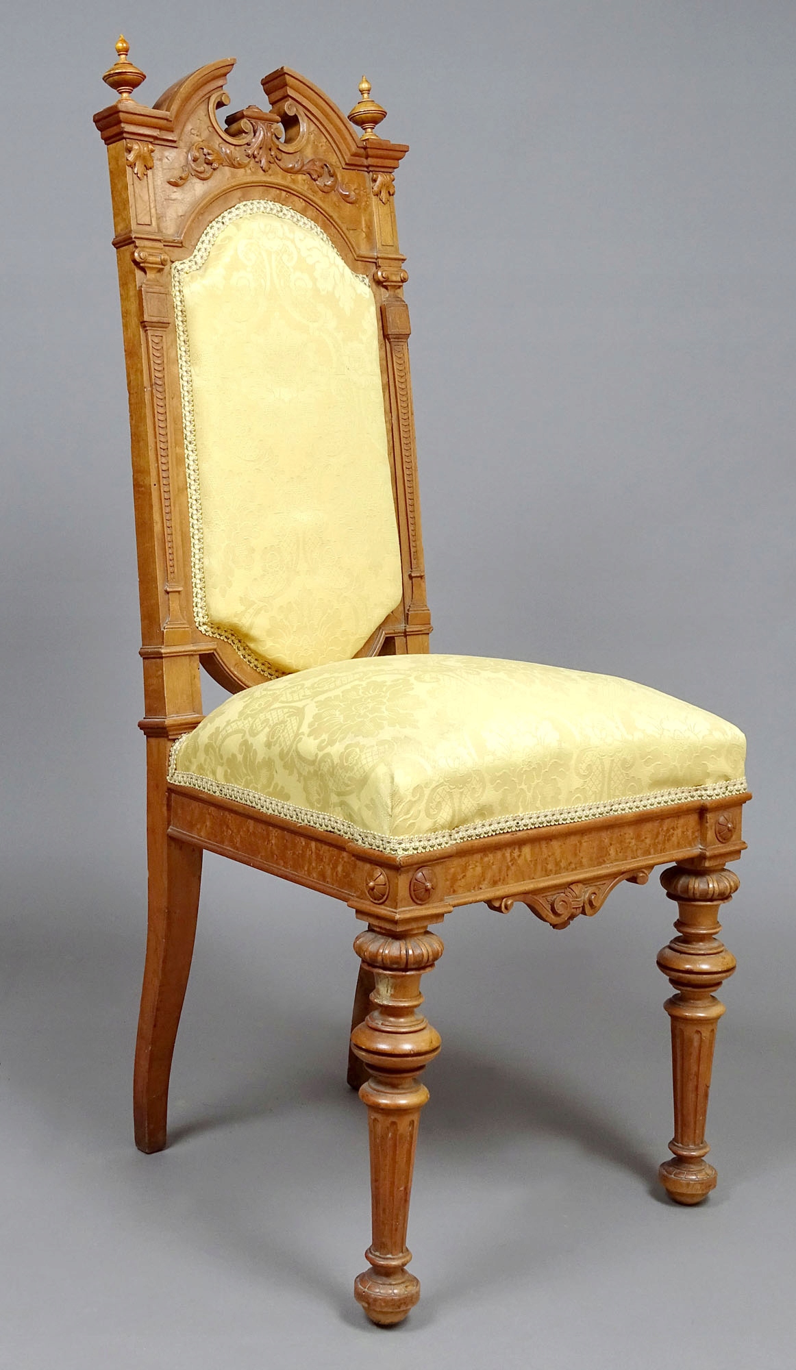 Всі меблі декоровані ажурними аплікаціями з дерева, оригінальні малюнки на ящиках і дверцятах з врізними сталевими замками. На верхівках предметів, про які йдеться, розміщені різьблені вази з букетами квітів. З боків — плоскі, звужені донизу різьблені пам’ятки, над ними точені аплікації, деякі з чотирма виступами з боків. Кожен предмет меблів спирається на чотири ніжки, передні у вигляді приплюснутих кульок, задні кутові. Численні тиснення, декоративні дерев'яні планки, різьблені аплікації, в тому числі великі на передній частині ліжка. Дзеркала в дуже хорошому стані, без царапин.