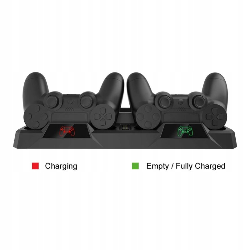 Підставка дозволяє розмістити консоль PlayStation 4, PlayStation 4 SLIM або PlayStation 4 PRO на бічній стінці. Це економить місце. Підставка виготовлена з міцного пластику і додатково посилена металевою пластиною знизу для кращої стабілізації. Підставка оснащена 2 вентиляторами для охолодження консолі. Станція містить 2 док-станції для заряджання та індикатор заряду планшета з підсвічуванням. Додатково стенд оснащений підставкою на 16 ігор. У комплект входить чотири перехідники, які встановлюються в колодку, завдяки чому гніздо для зарядки не пошкоджується при постійному вставленні в нього наконечника зарядного пристрою. Підставка живиться від роз'єму Micro USB. У набір входить кабель USB – Micro USB довжиною 30 см, який можна під’єднати до роз’єму USB на консолі або іншого роз’єму, напр. настінний зарядний пристрій. Стильний зовнішній вигляд станції ідеально поєднується з дизайном консолі.