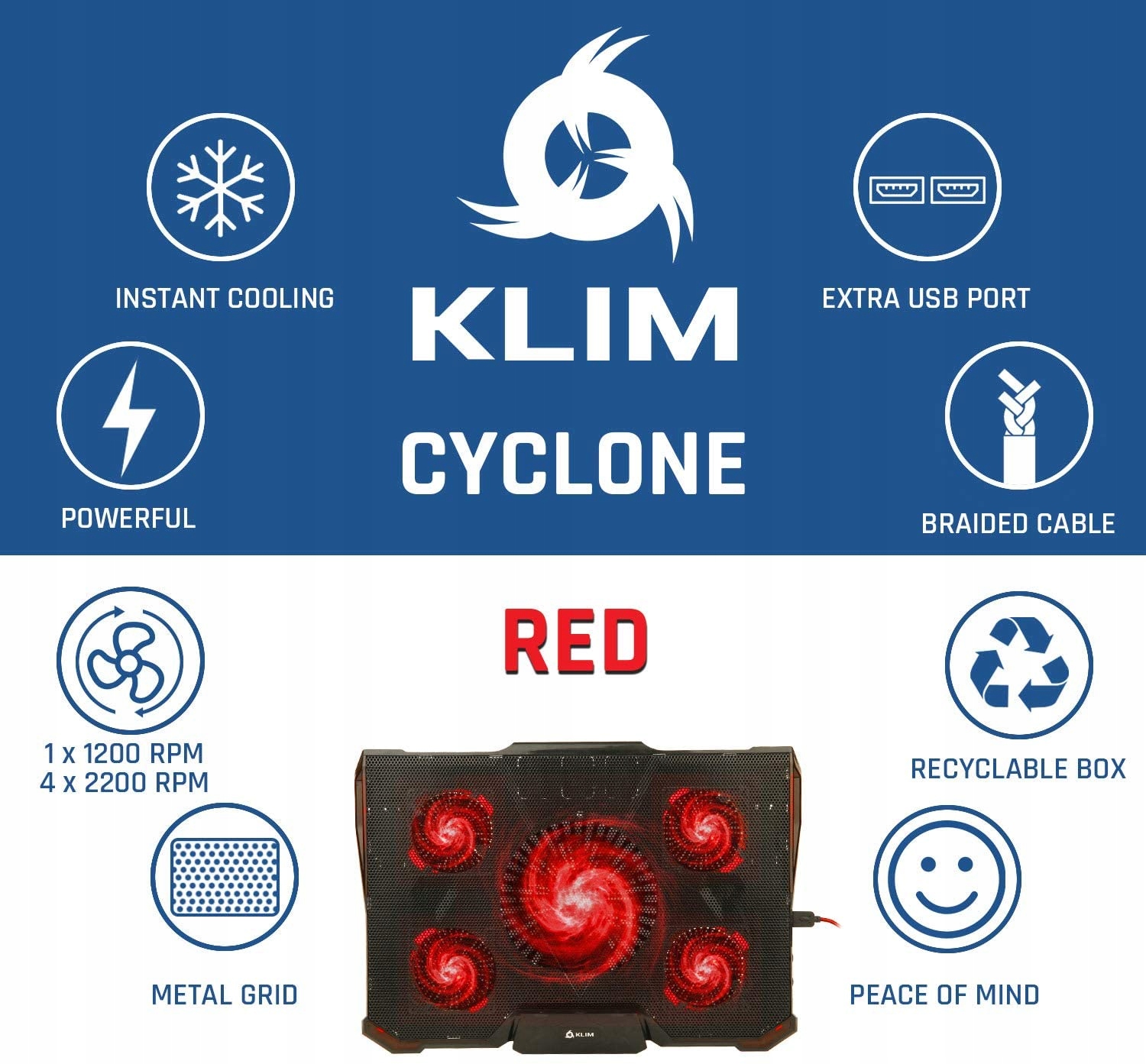 ✅ НАЙПОТУЖНІШИЙ НА РИНКУ. KLIM Cyclone скине свого старшого брата KLIM Wind. З 4 вентиляторами, що обертаються зі швидкістю 2200 об/хв + 1 вентилятором зі швидкістю 1200 об/хв, ви не знайдете нічого потужнішого. Це високопродуктивна підставка для ноутбука з можливістю охолодження комп’ютера до розумної температури за лічені хвилини. На відміну від інших моделей лише з 1 вентилятором, ця має 5 вентиляторів, що дозволяє KLIM Cyclone охолоджувати будь-яку область ноутбука.