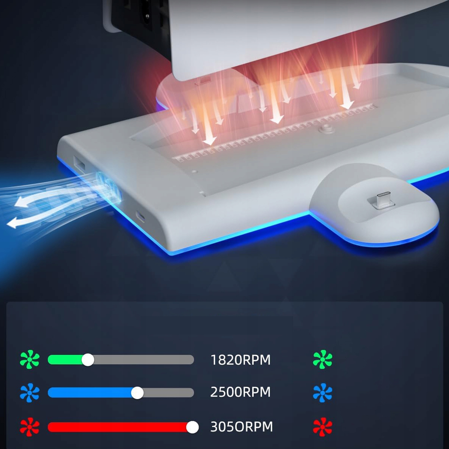 Підніміть атмосферу вашої гри за допомогою настроюваних налаштувань освітлення RGB. Наша охолоджувальна станція PS5 Slim виходить за рамки функціональності та додає вашій ігровій системі яскраву естетику. Виберіть один із семи захоплюючих кольорів світла (червоний, зелений, синій, фіолетовий, блакитний, жовтий, білий) і відкрийте для себе дев’ять режимів освітлення, щоб покращити ваші враження від гри завдяки візуально привабливим кольорам і ефектам.