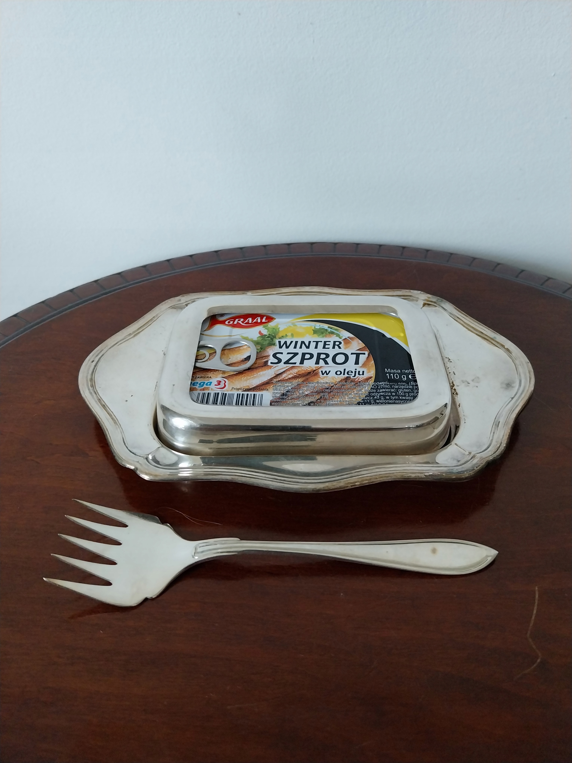 Гарна підставка під банку шпрот, підписана, розмір основи 18,5 х 12,5 см, кришка 11,5 х 8,5 см, потертості на посрібленні видно на фото, вилка підписана, довжина 14 см, стан як на фото. добре