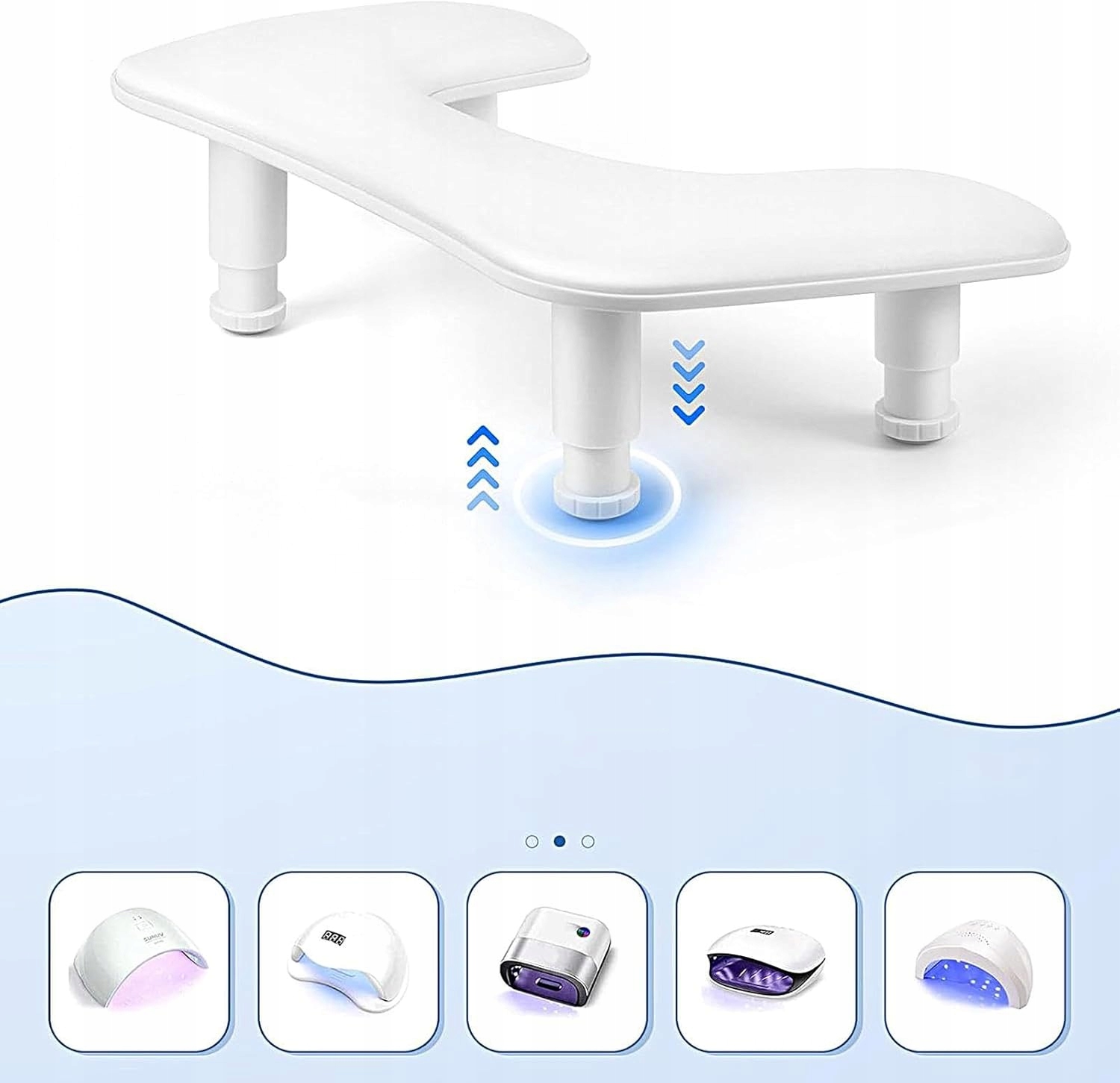 Завдяки компактній конструкції, що складається, підлокітник можна легко зберігати та транспортувати. Центральна частина дозволяє розмістити УФ-лампу, пилосос для нігтів або тримач для телефону, зберігаючи станцію акуратною та функціональною.