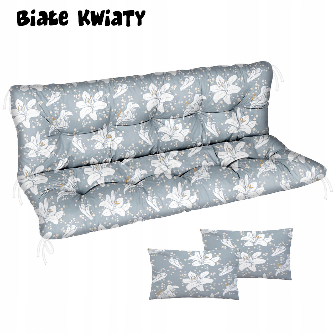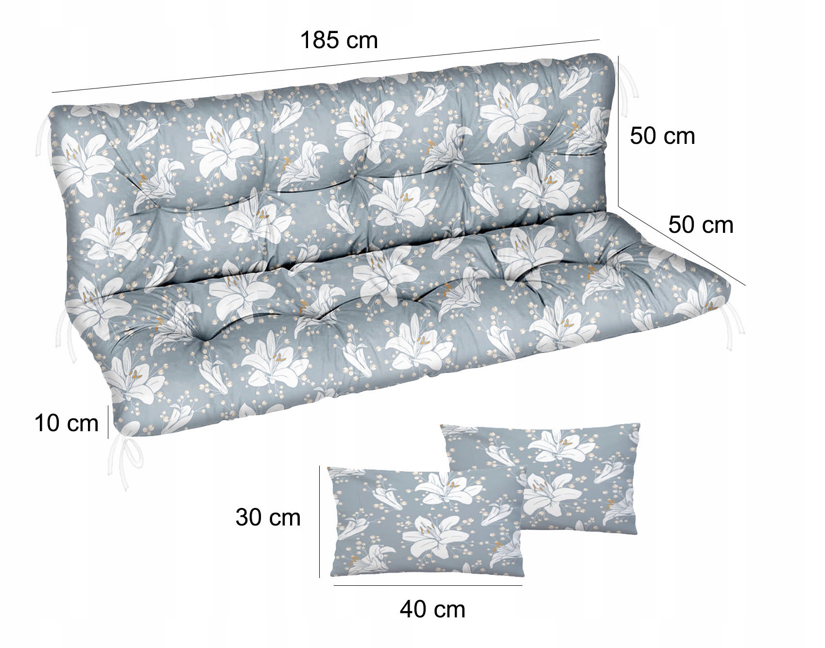 Садові подушки складаються з 2 частин, у кожному кутку вони оснащені шнурками для кріплення. Стьобана оббивка має товщину приблизно 10 см, що робить її надзвичайно зручною. Дві додаткові подушки (розміром 40 х 30) можна використовувати як підлокітники.