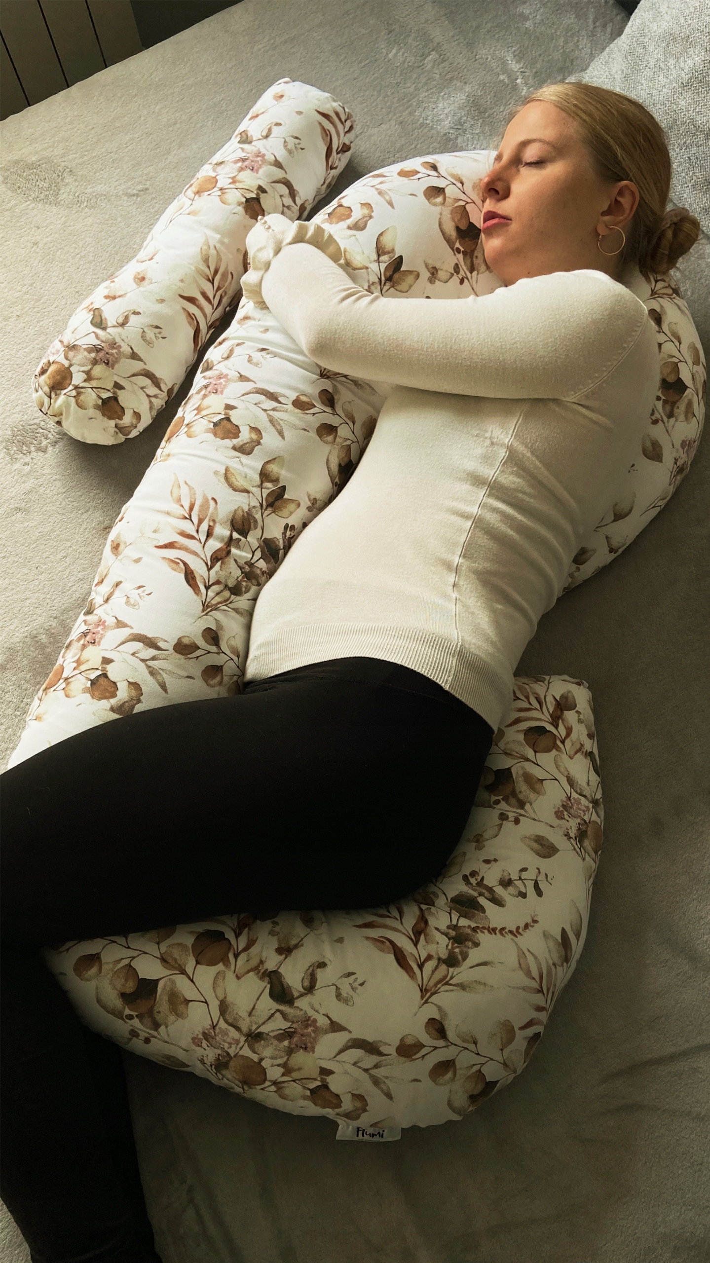Подушка для вагітних - чудова підтримка під час годування дитини. Його форма забезпечує ідеальне прилягання до тіла матері. Просто оберніть подушку навколо талії і покладіть на неї дитину. Завдяки оптимальному розміру та С-подібній конструкції, він гарантує максимальний комфорт при годуванні, розвантажуючи хребет і підтримуючи плечі.