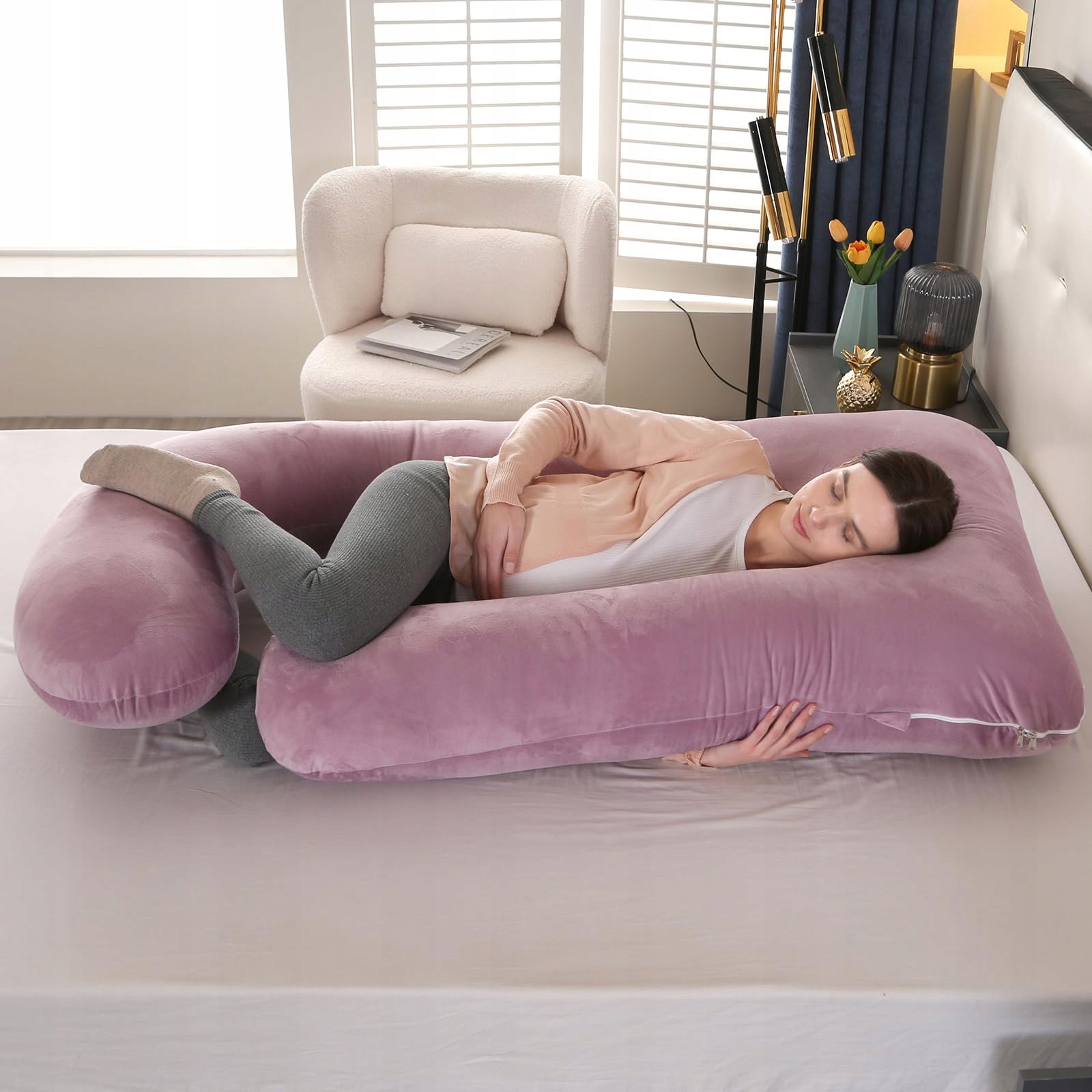 Ця J-подібна подушка для вагітних чудово підходить для вагітних жінок і людей після операції, використовується як опорна подушка. Допомагає при болях у поперековому відділі хребта, підтримує положення сну на боці та допомагає при фізіотерапії, фіброміалгії. Також ефективний у боротьбі з печією, кислотним рефлюксом, дискомфортом або тривогою під час вагітності.