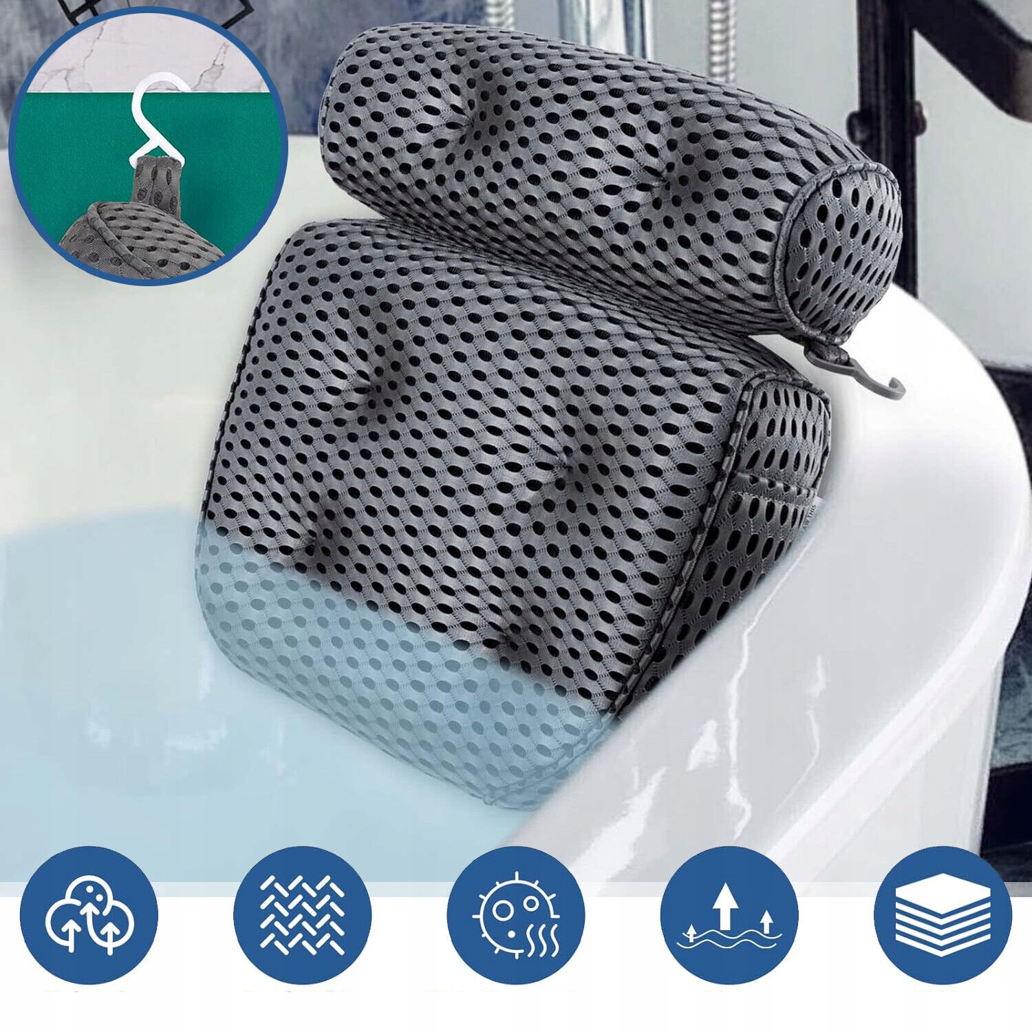 Подушку можна прати в холодній воді. Сушити тільки на повітрі, не прасувати. Подушка для купання має гачок, на який ви можете повісити її на вішалку для рушників або халат у ванні чи душі для швидкого та легкого висихання на повітрі. Він легко чиститься, пропускає повітря та вологу та дуже швидко висихає, запобігаючи появі неприємних запахів, цвілі та бактеріальних інфекцій.