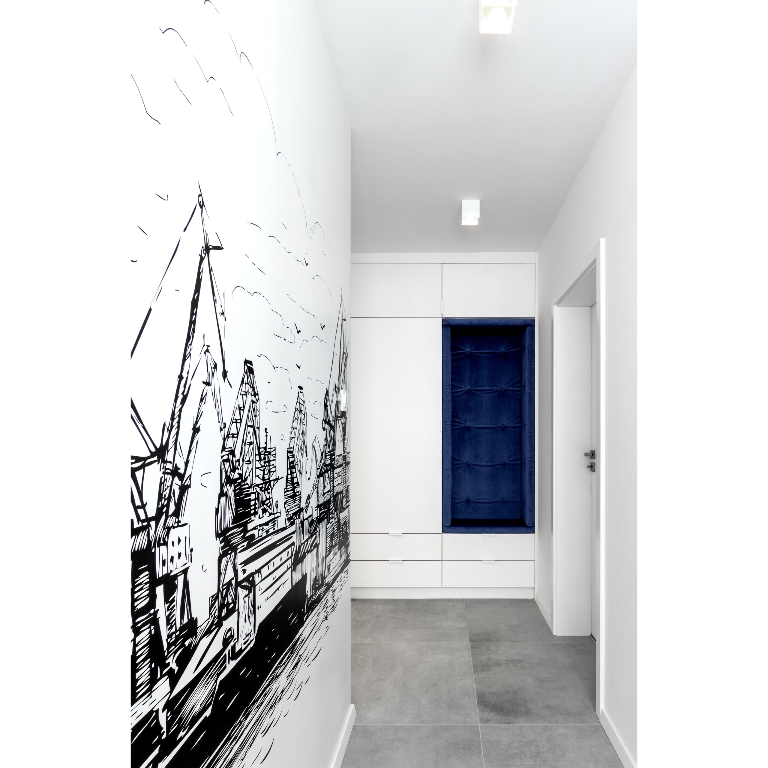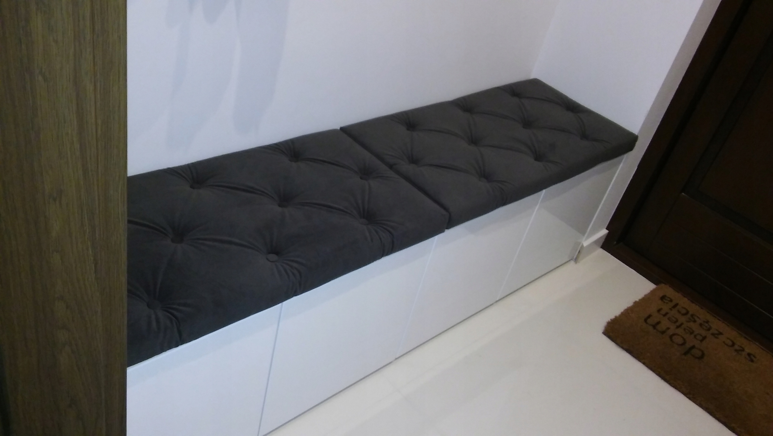 Приклад облаштування вбудованої ніші в передпокій, виконаної точно за розміром. Пошитий з кобальтового плюшу з квадратним стьобанням і підкладкою з самоклеючими липучками для легкого самостійного збирання.