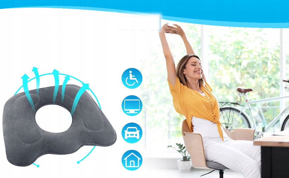 - ✔️- Подушка має ергономічну форму пончика, щоб зменшити тиск на куприк і область тазу, зменшуючи дискомфорт і біль, спричинені тривалим сидінням.