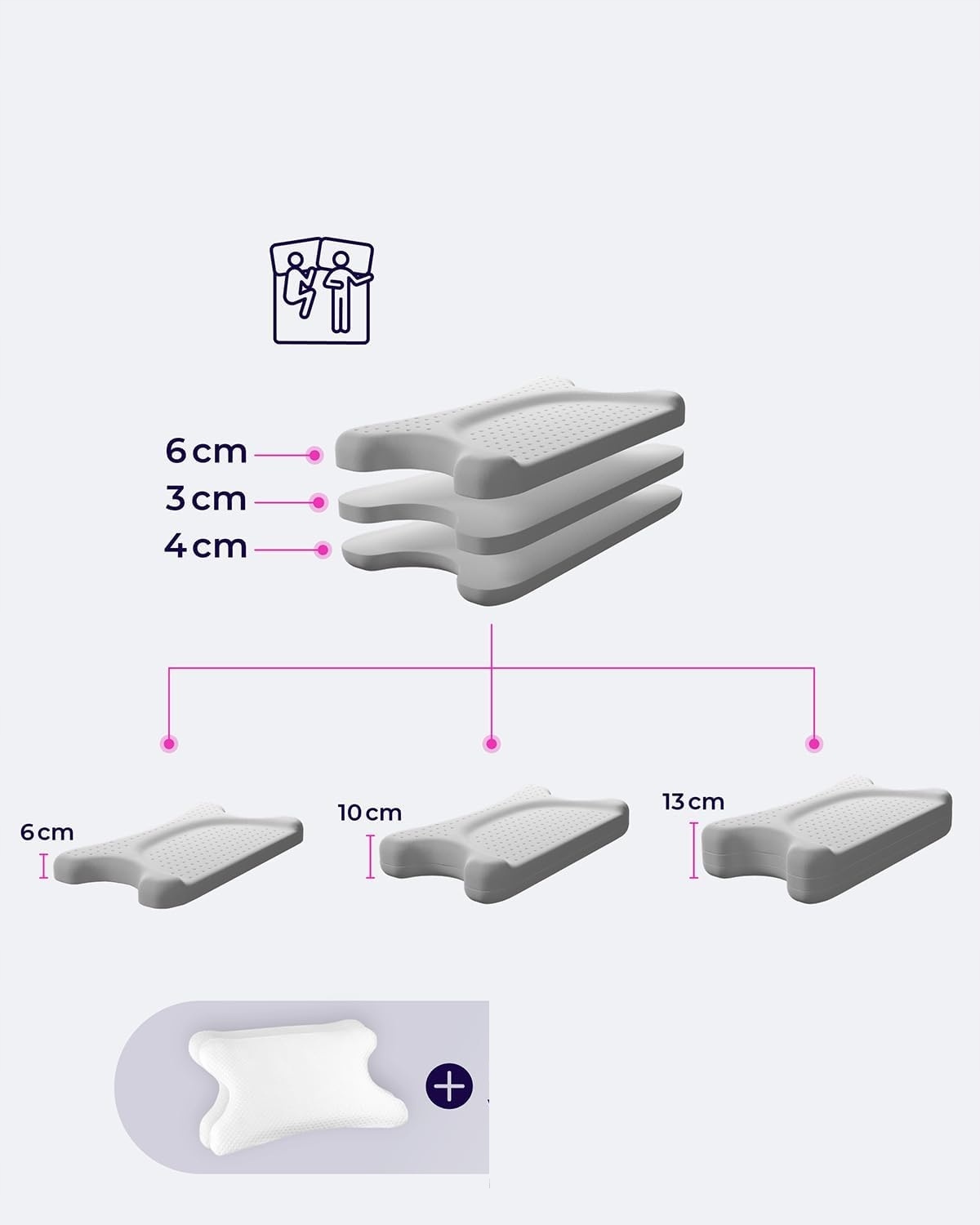 Сон для всіх: запобігайте напрузі м’язів і суглобів за допомогою нашої регульованої подушки для сну, яка завдяки 3 різним шарам – подушці для сну на животі, спині та боці в одному – адаптується до будь-якої форми тіла та положення під час сну.