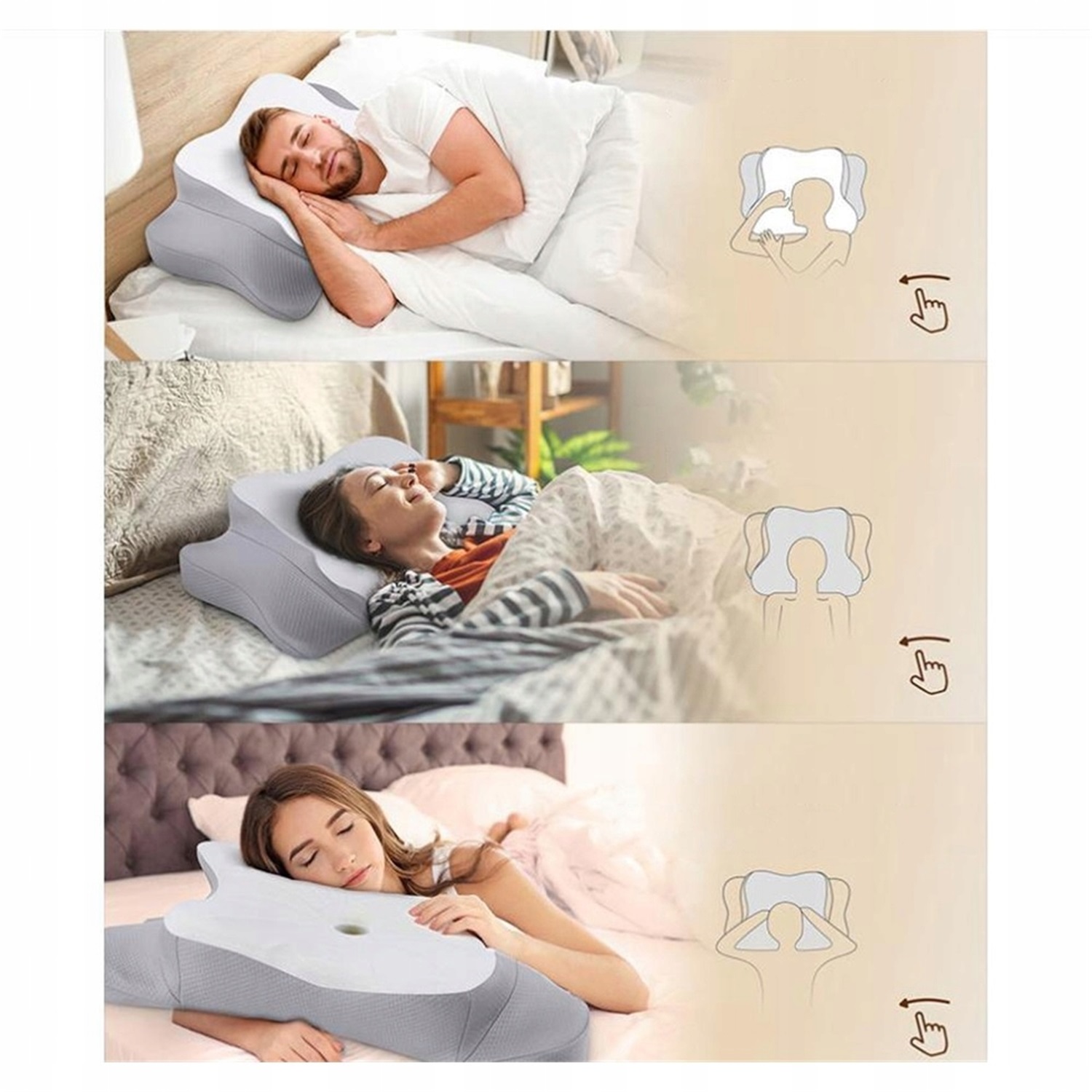 Важко знайти подушку потрібної висоти? Наша шийна подушка має дві висоти, щоб вибрати потрібну висоту для вашого положення під час сну. Спеціальні канавки дозволяють комфортно лежати рукам. Ця ортопедична подушка підходить для будь-якого положення сну, наприклад для сну на животі, спині чи боці.