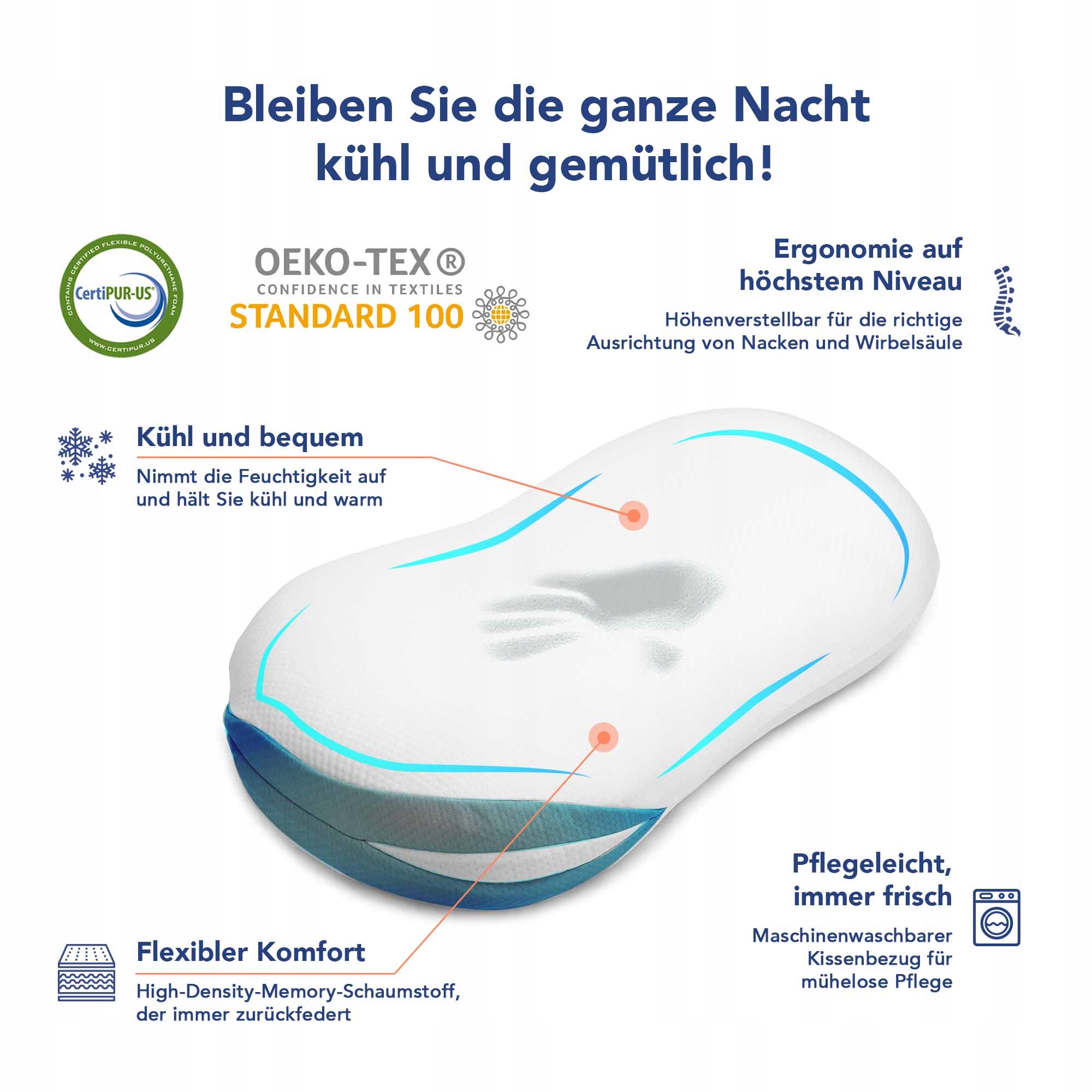 Інноваційний матеріал Memory Foam у поєднанні зі спеціально розробленим покриттям забезпечує зручну підтримку шиї під час сну та забезпечує спокійну ніч без дискомфорту.