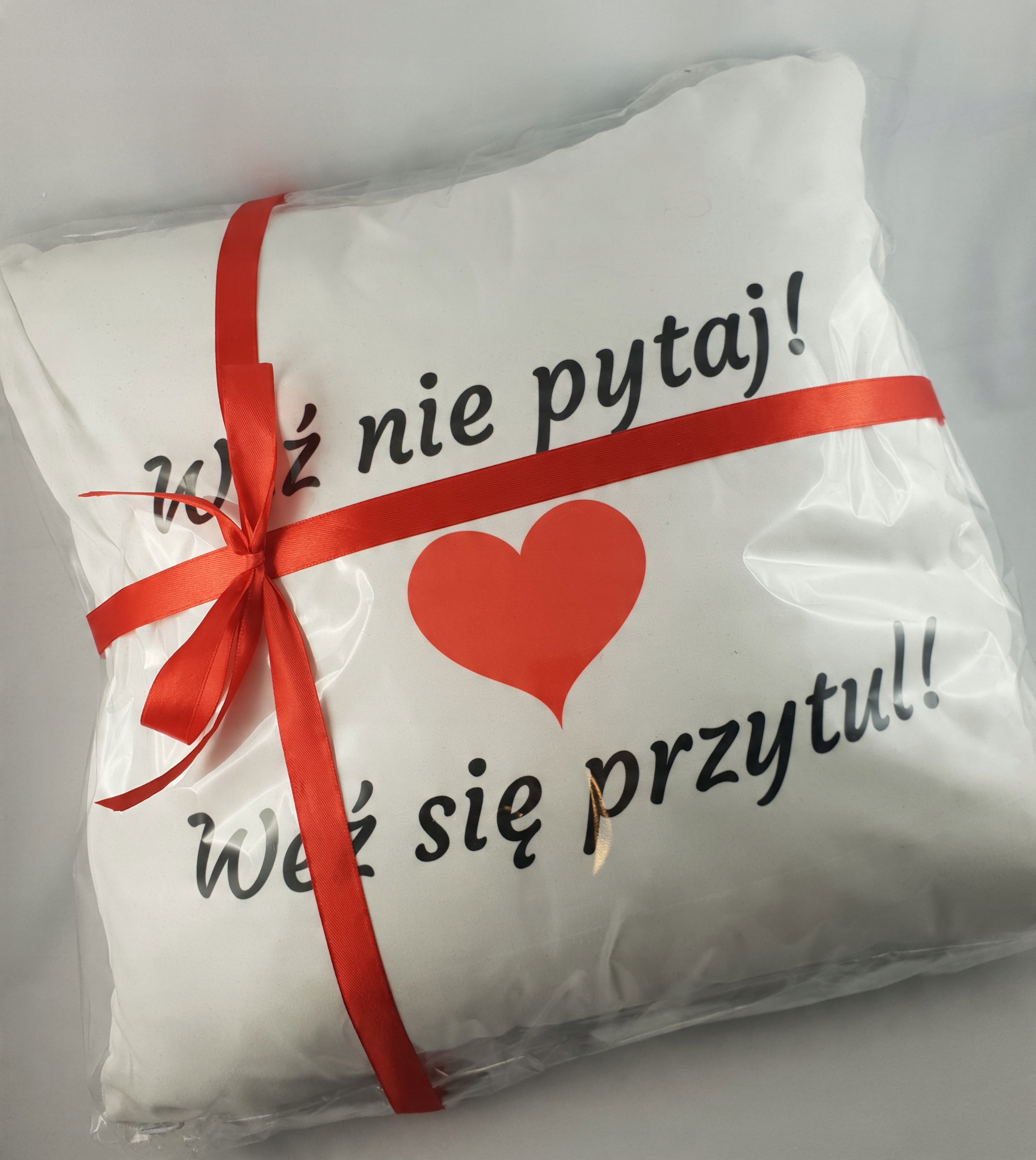 Подушка загорнута в целофан і перев'язана червоною стрічкою.