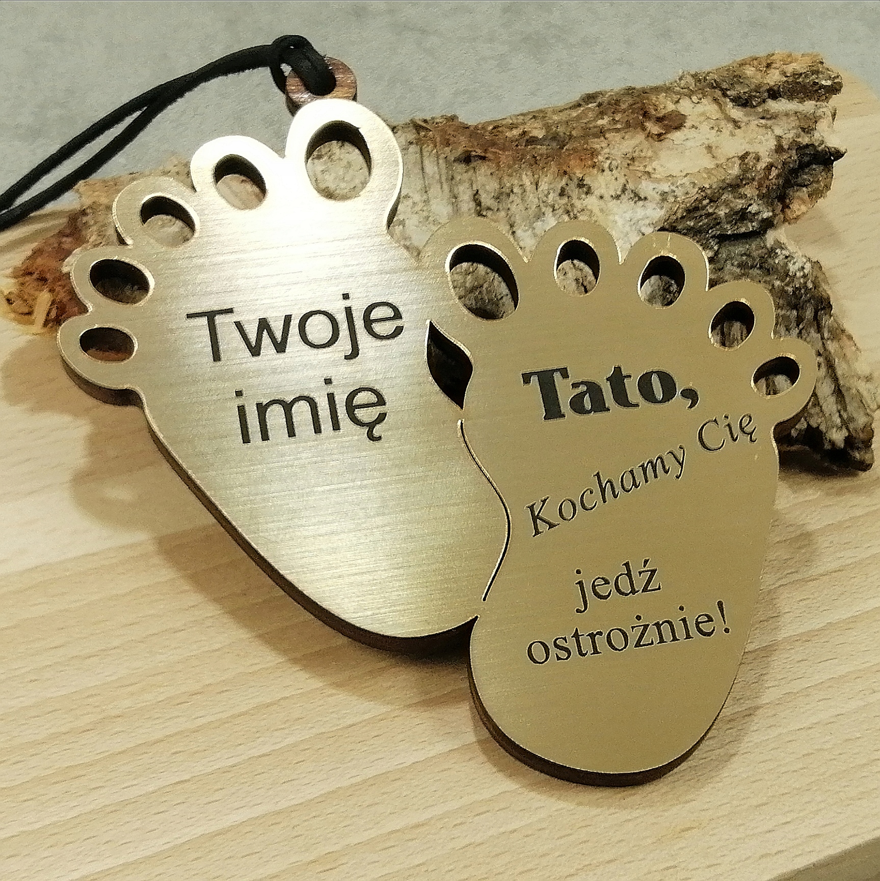 Підвіска виготовлена з березової фанери, пофарбована та захищена екологічним лаком, а зовні покрита сріблястим ламінатом. На ламінаті вигравірувано напис та імена близьких, які чекають водія вдома. Гравірування є постійним методом і не зітирається. До кулона йде ремінець з натуральної шкіри - колір вибирається випадково.