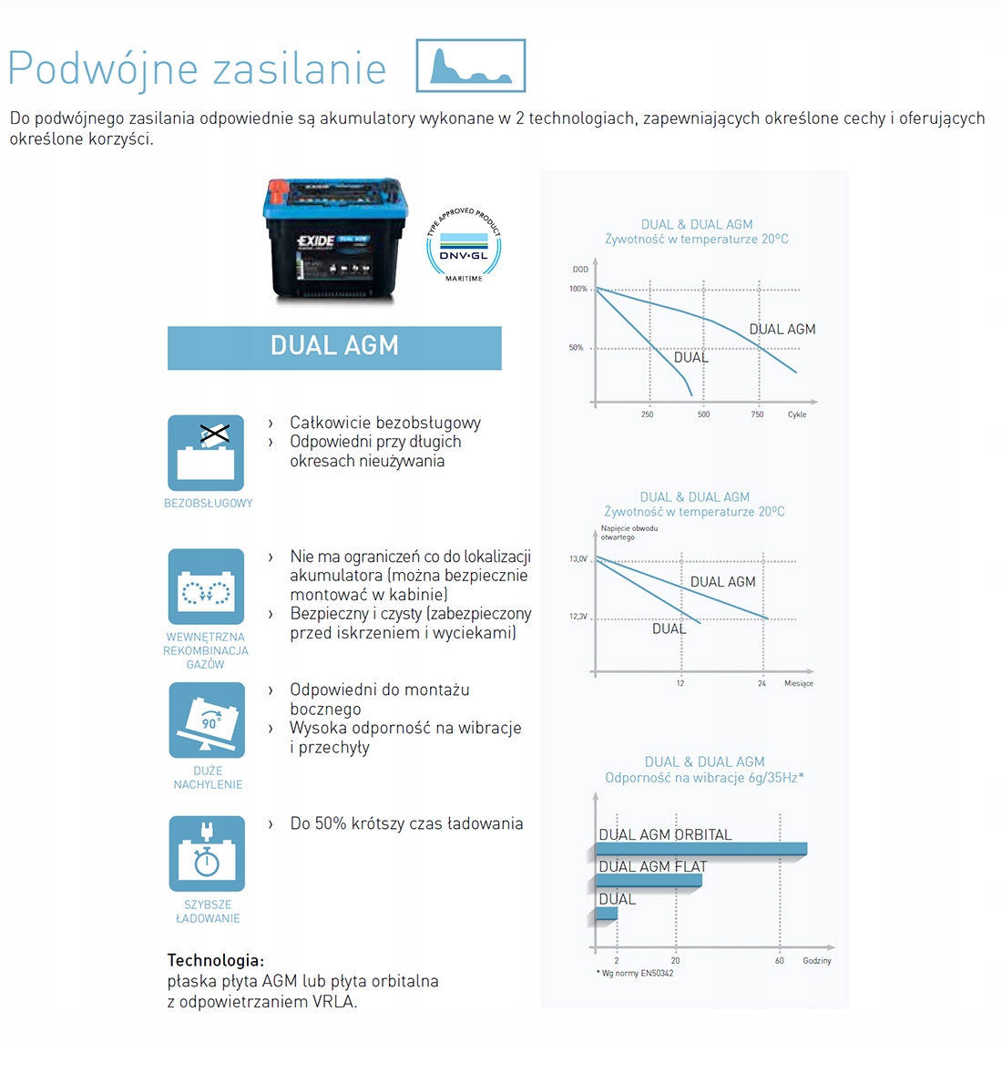 Акумулятор, розроблений для живлення більшості типів кемперів і караванів, характеризується хорошою пусковою потужністю. Його конструкція передбачає різні варіанти встановлення (у салоні, у боковому положенні), полегшує обслуговування (повністю необслуговувана батарея, придатна для тривалого простою, економить час зарядки до 50%) та гарантує надійність (висока стійкість до вібрації та нахилу, захист від витоків).