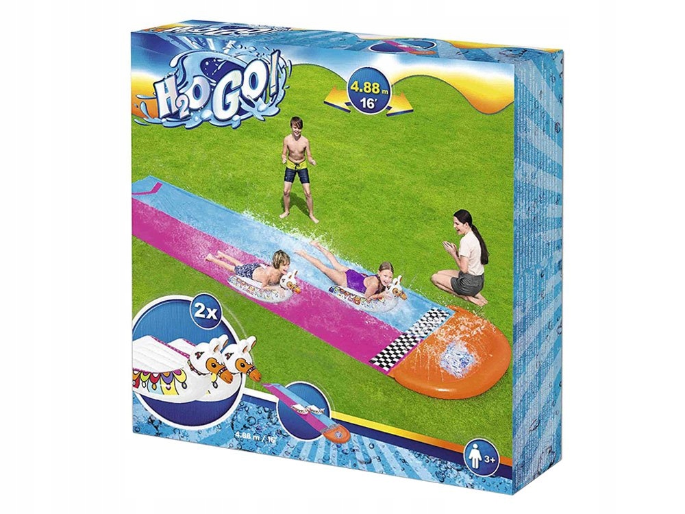 Подвійна водна гірка H2O GO! LAMA RAMAз надувними ламами є однозначним фаворитом літніх розваг на природі цього року. Гірка має подвійну доріжку довжиною 488 см, зрошується за допомогою підключення садового шланга до душових кабін, розташованих у гірці. Безсумнівною новинкою в цьому виді доріжок є два надувних матраца для серферів, що входять до комплекту. Відтепер кожна літня вечірка може перетворитися на перегони для дітей зі своїми барвистими ламами.