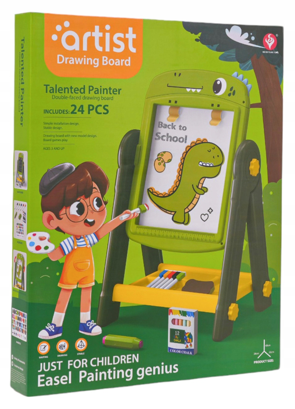 Двостороння табличка на підставці з аксесуарами для дітей віком від 3 років. Дизайн стійки стабільний і простий у встановленні. Дошки з обох боків магнітні, ви можете прикріпити магніти від набору до них. На чорній стороні він малює крейду, а на білих фетрових ручках. Набір включає крейду, крейду, маркер та магніти з літерами, цифрами та математичною діяльністю. Практична полиця для аксесуарів, доступних у наборі, була розміщена під дошкою. На білій стороні зверху прикріплені дві затискачі, до яких ми можемо прикріпити аркуш паперу. Набір розвиває ручні навички, вправляє руку. Функції набору