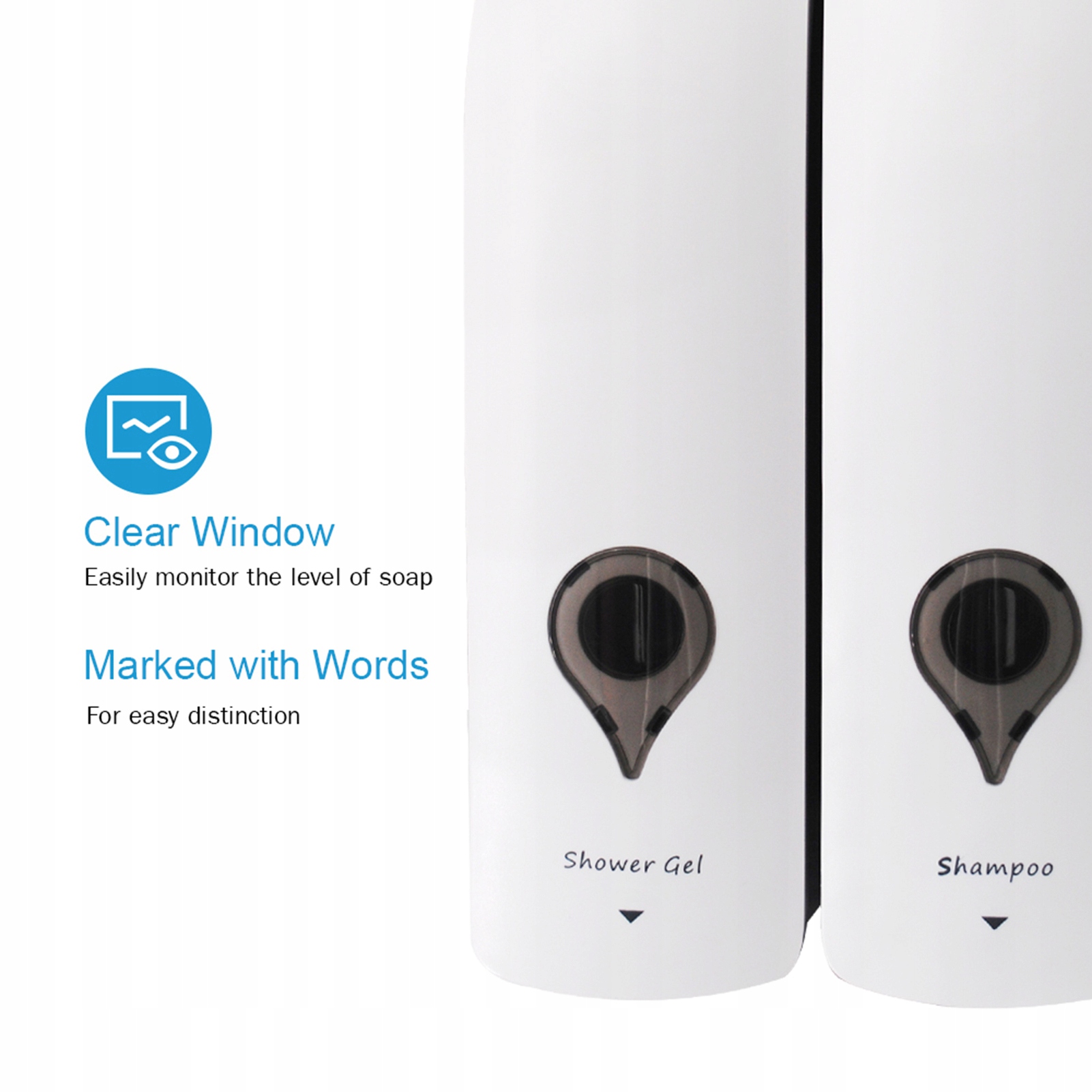 - Диспензатор мила з подвійною головкою, кожна пляшка має потужність 300 мл, і кожен раз, коли вона витрачає 0,8 мл бальзаму тощо.