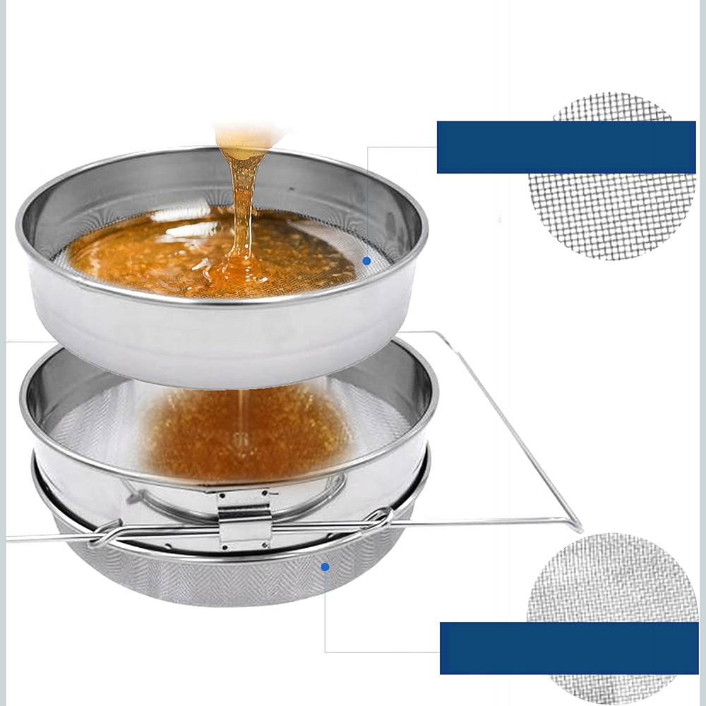 Ми виробляємо цей фільтр для меду з інноваційним дизайном подвійного сита та двома окремими ситами, що забезпечує ефективний процес фільтрації меду. Після збору у вас буде більш гладкий мед світлішого кольору, ідеальний для особистого використання чи продажу.