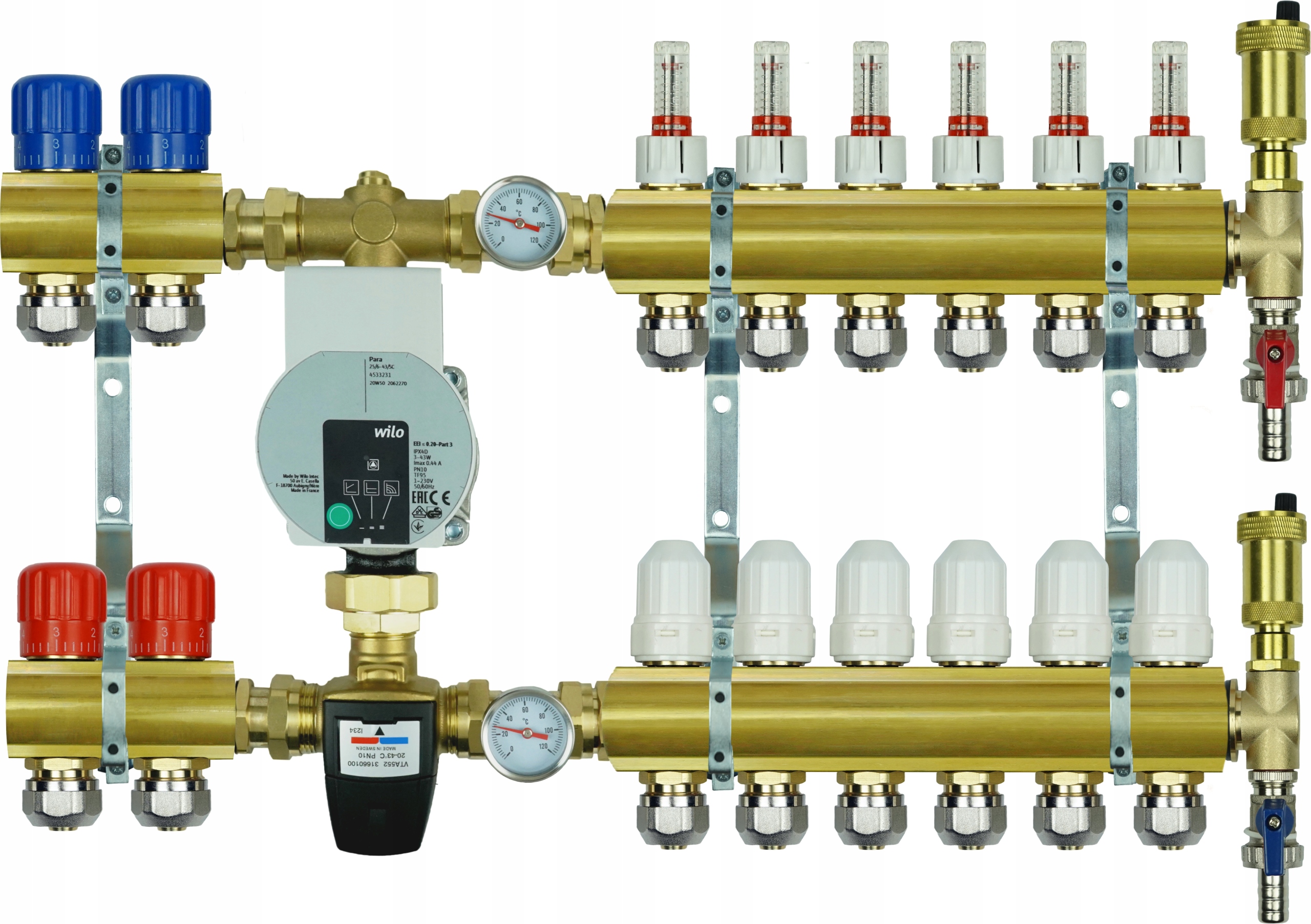 - Термостатичний клапан з ручкою M30 x 1,5 з соском (адаптований до монтажу приводу) та роз'єми для труби PEX ¾ "x 16 (6 шт.); < Li> Автоматичний вентиляційний отвір ½ "(1 шт.);