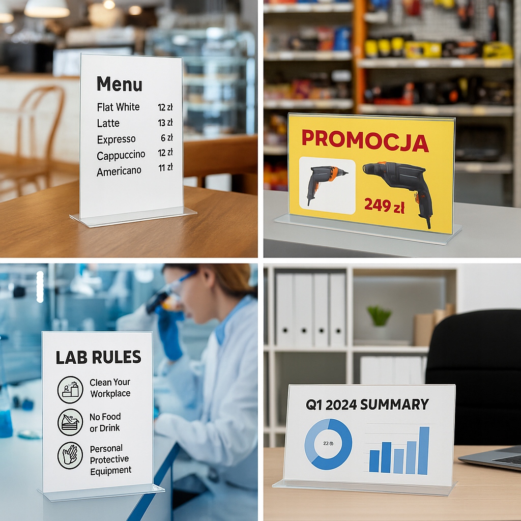 подвійний горизонтальний стенд у форматі A4 -це практичне рішення для естетичної презентації меню, списків цін, пропозицій, інструкцій чи іншої інформації. Виготовлений з прозорого оргскла товщиною 2 мм, він забезпечує чудову видимість матеріалів, розміщених з обох боків. Це ідеально в місцях, де виставка потрібна з двох напрямків, наприклад на лічильниках, столах або прийомах.