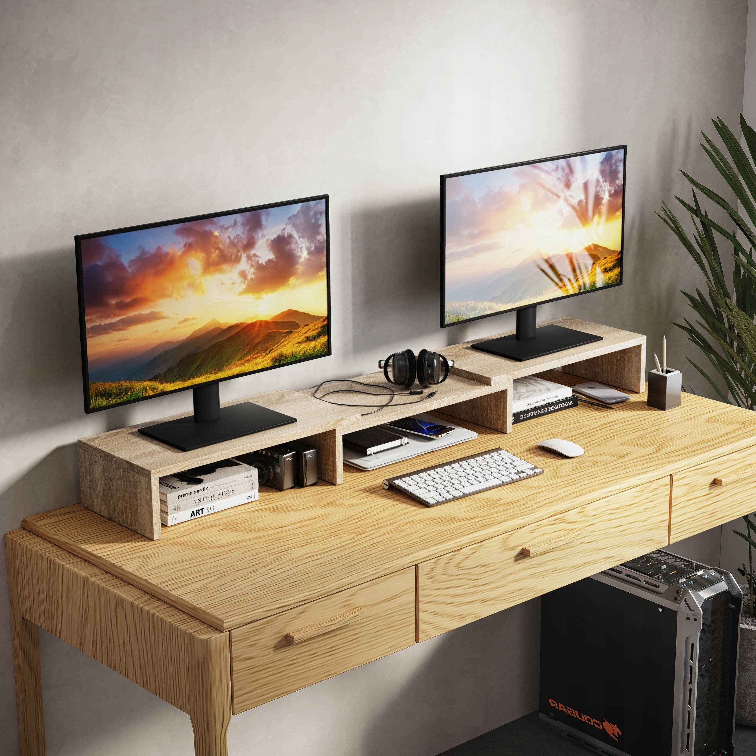 ✔️ Місце для зберігання під підставкою для монітора дозволяє організувати офісне приладдя та аксесуари. Тут ви можете розмістити нотатки, клавіатури, мишки, кухлі, ігрове обладнання та багато іншого. Тепер ваш стіл буде охайним і організованим.