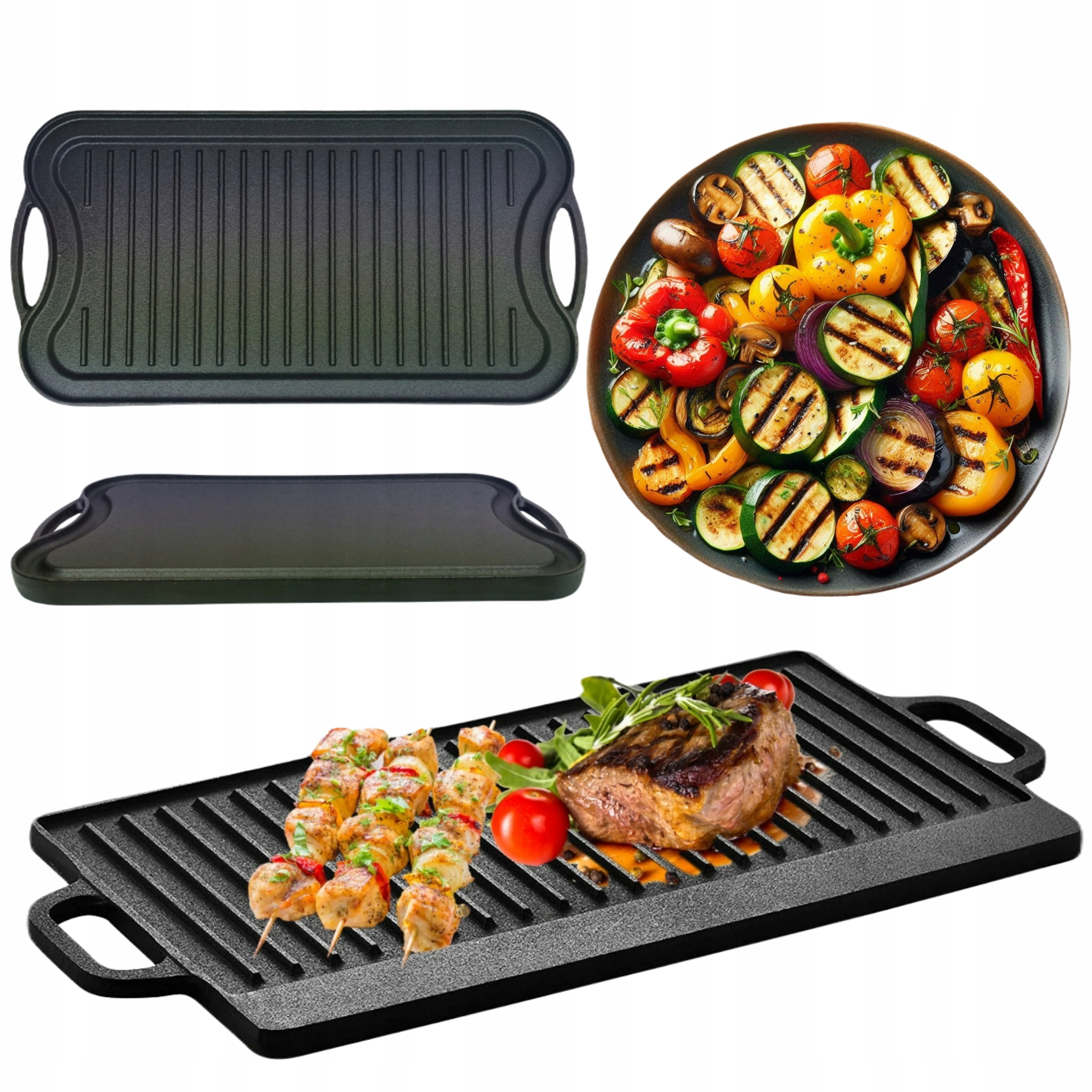 One page is smooth , ideal for frying eggs, sleeping eggs and delicate Fish , the other side of the ribbed, excellent for meat grilling