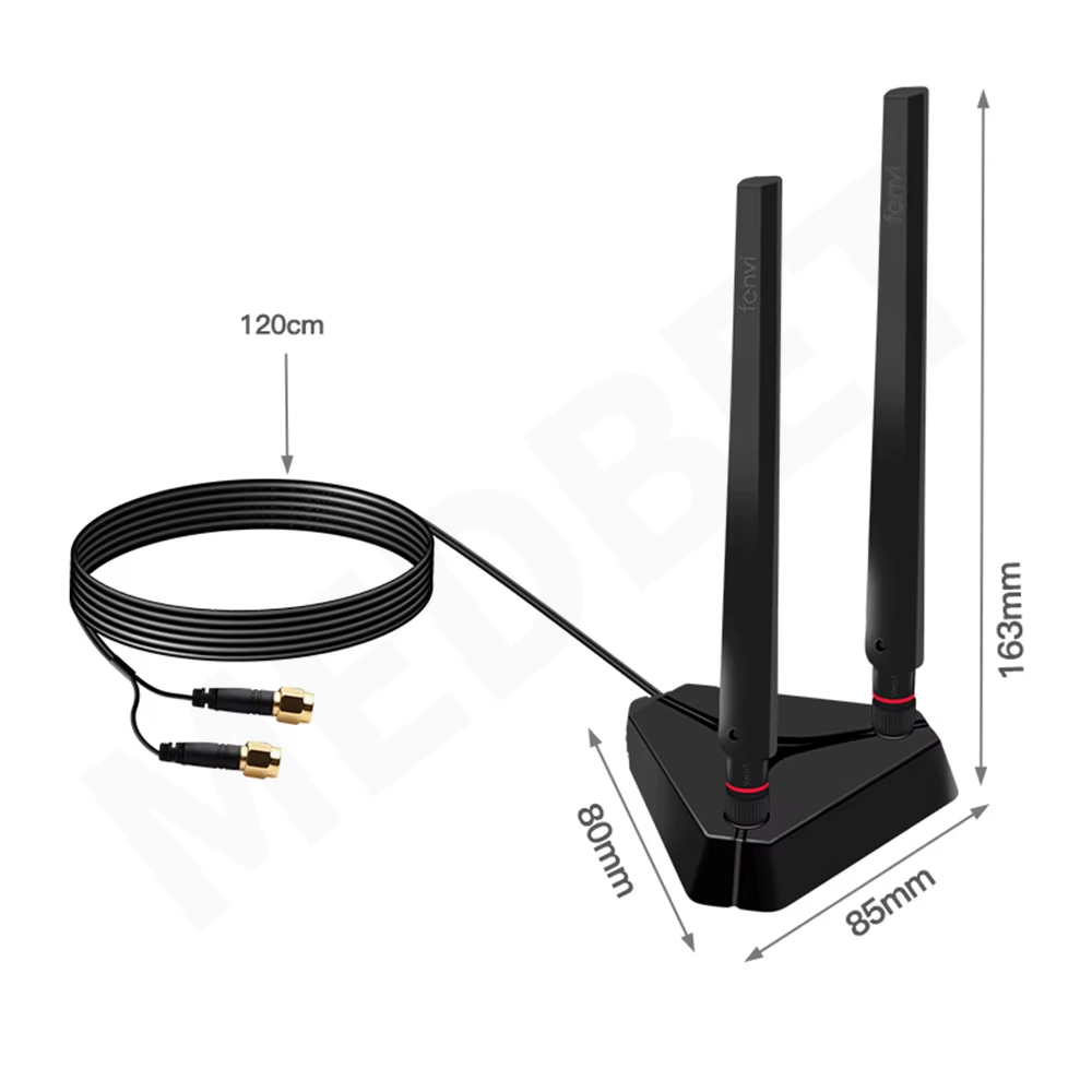 - Два роз’єми SMA в одній антені – сумісна з багатьма пристроями, такими як маршрутизатори, модеми, підсилювачі сигналу тощо – вам не потрібно купувати дві окремі антени, якщо у вашому маршрутизаторі, модемі тощо є подвійний роз’єм SMA – антена також працює бездоганно й ефективно за допомогою одного штекера