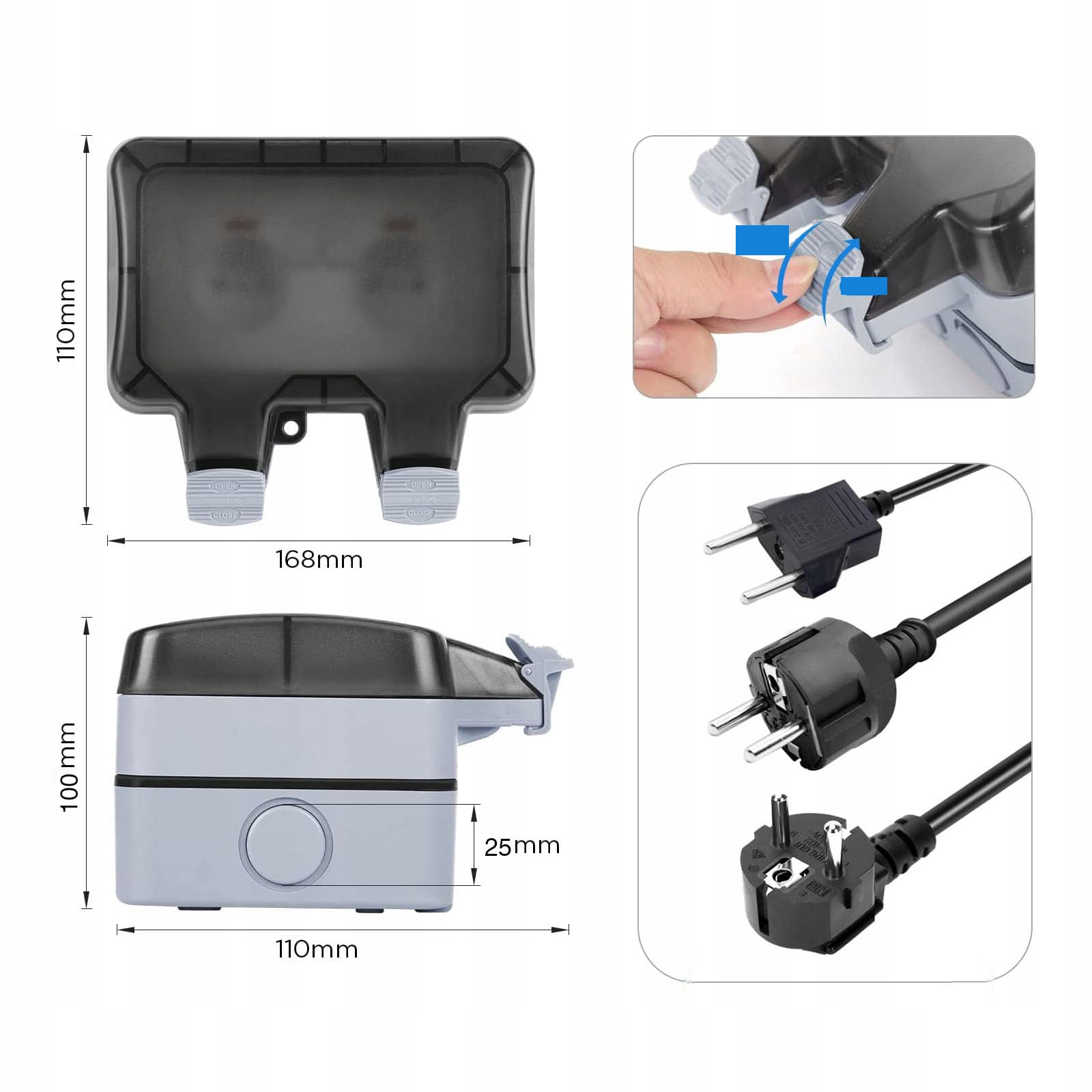 Дві секції водонепроникної зовнішньої розетки захищені сильними гумовими прокладками, а стійка, міцна пластикова кришка ABS захищена 2 рамками, що перекриваються, і безперервними гумовими ущільнювачами. Закони та гвинтові з'єднання на вході кабелю забезпечують щільне закриття. Сертифікат IP66 означає захист від зовнішніх потрясінь, пилу, вітру та сильних водних потоків.