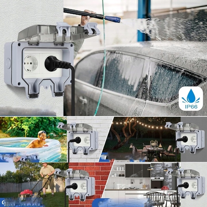 - МАТЕРІАЛ КОРПУСУ - ПЛАСТИК - стійкий до погодних умов. Зовнішня електрична розетка витримує будь-які погодні умови та дуже довговічна. Кришка захищає електричні розетки від погодних умов. Чохол застібається на пряжки, щоб вода і пил не потрапляли всередину. Щоб захистити дітей від небезпеки, завжди закривайте кришку незалежно від того, увімкнено чи вимкнено живлення.