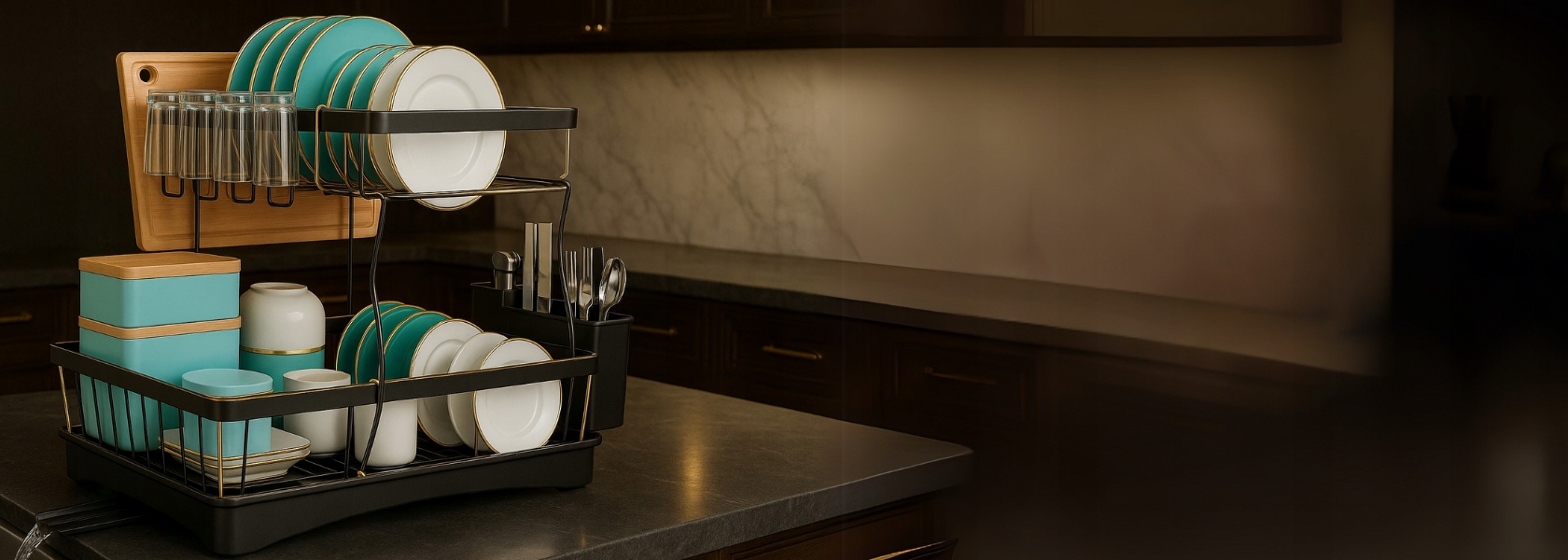 Завдяки двом рівням ви можете розмістити більше посуду на одній стільниці. Нижня полиця ідеально підходить для тарілок і мисок, а верхня – для кухлів і чашок. Це практичне рішення дозволяє підтримувати кухню в чистоті та порядку.
