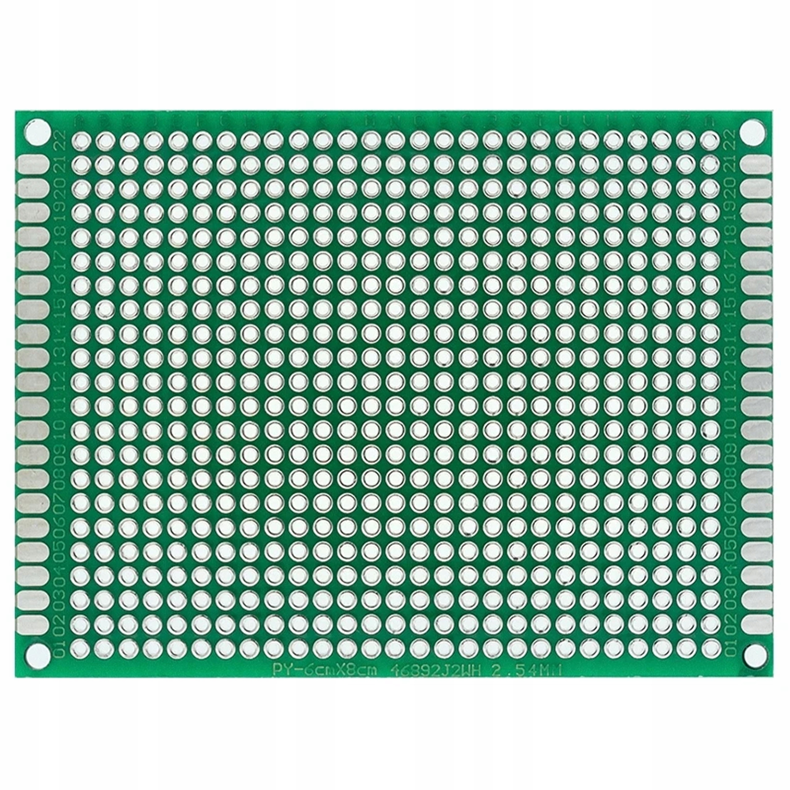 Подвійна універсальна плитка розміром 60 х 80 мм, призначена для побудови прототипів, виготовлених з хронічних елементів (THT), таких як резистори, конденсатори, світлодіоди та інтегровані схеми в корпуси DIP. Плитка дозволяє встановлювати будь -яку електронну систему завдяки отворам 2,54 мм, розташованими в прямокутній матриці.