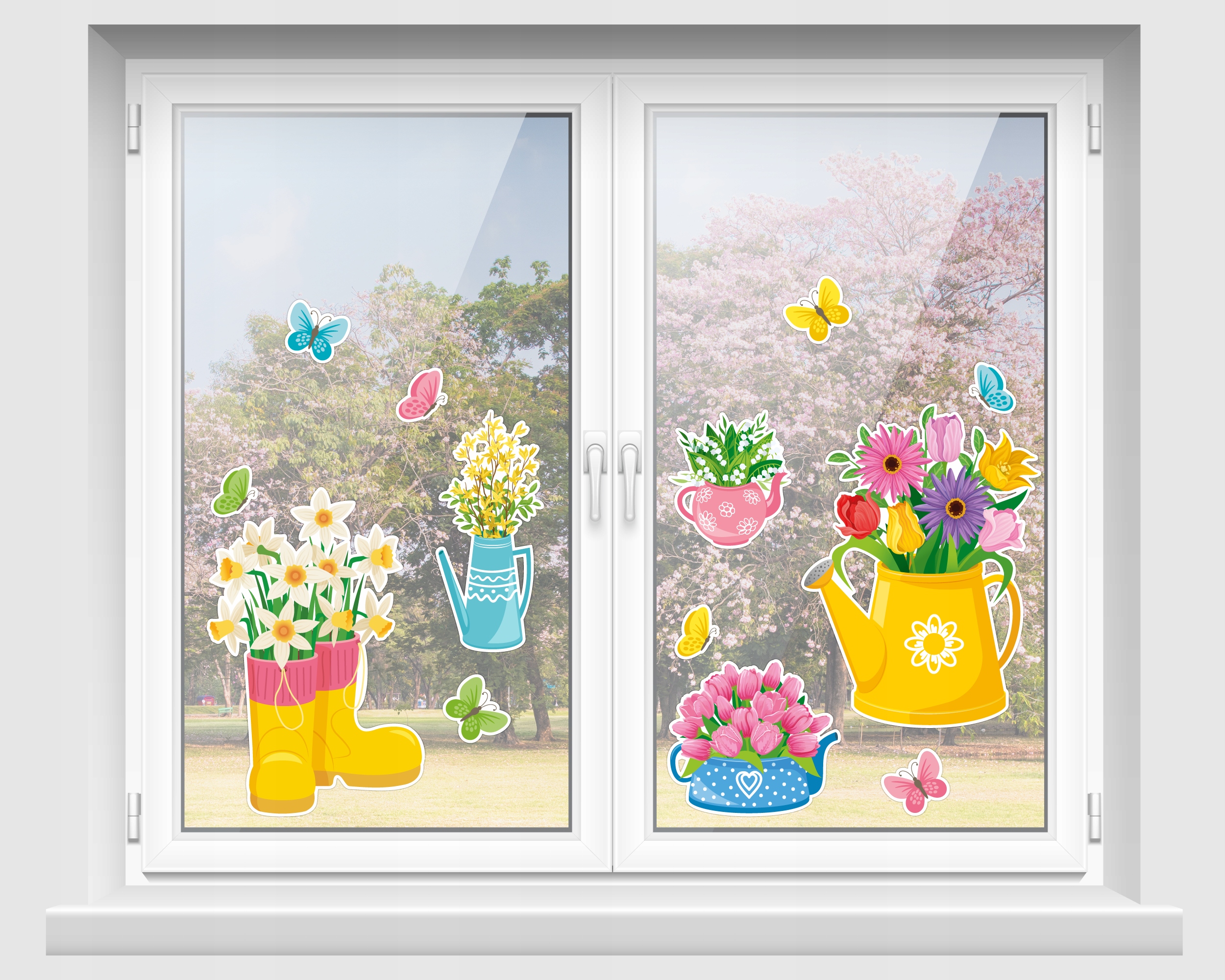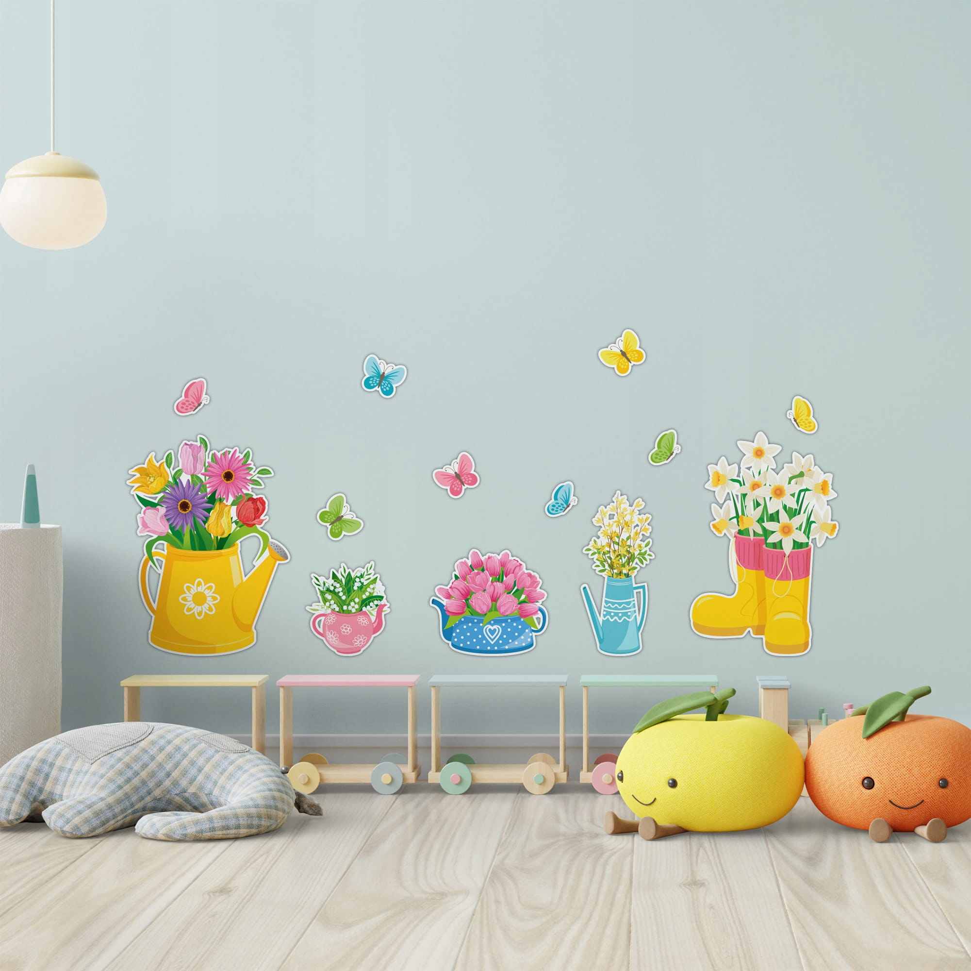 Набір складається з 5 різних барвистих незвичайних ваз із пружинними квітами (2 поливи, пари свердловин та 2 чайників) та 8 барвистих метеликів . ідеально підходить для весняної прикраси школи або дитячого садка.
