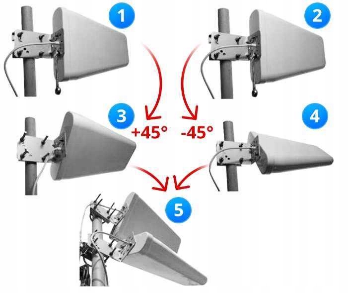 У разі використання набору з двох антен змініть поляризацію антен на X-CROSS. Відкрутіть тримач від антени та перемістіть його на +45 градусів.