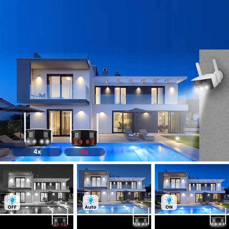 Камера має 4 ширину інфрачервоні світильники та 4 яскраво -білі світильники, завдяки яким вона працює не тільки вдень, але і вночі.