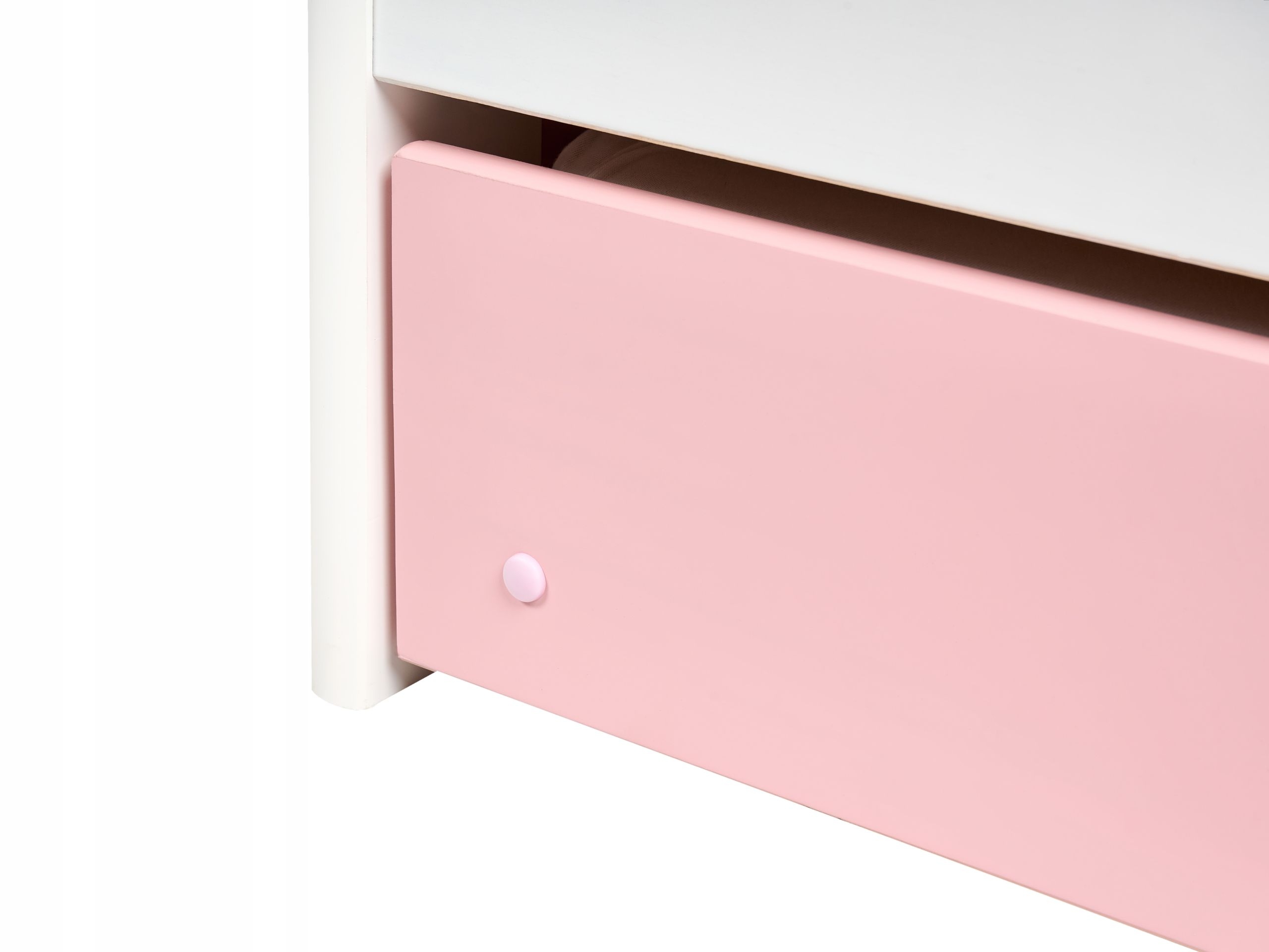 - це чарівне ліжко з висувним ящиком, виготовленим з сосни з сосни, намальованою в рожевому кольорі, вводить теплий і природний акцент у кімнату кожної дитячої. Ліжко має місце для двох матраців, що робить його ідеальним як спальне місце для друзів вашої дитини або для зростаючої родини, пропонуючи додатковий простір сну, не займаючи занадто багато місця. Його універсальний стиль ідеально поєднується з різними інтер'єрними композиціями, від сучасного до натхненного скандинавського дизайну. Міцний і естетичний, це ідеальне рішення, що поєднує функціональність з елегантністю в кімнаті вашої дитини.