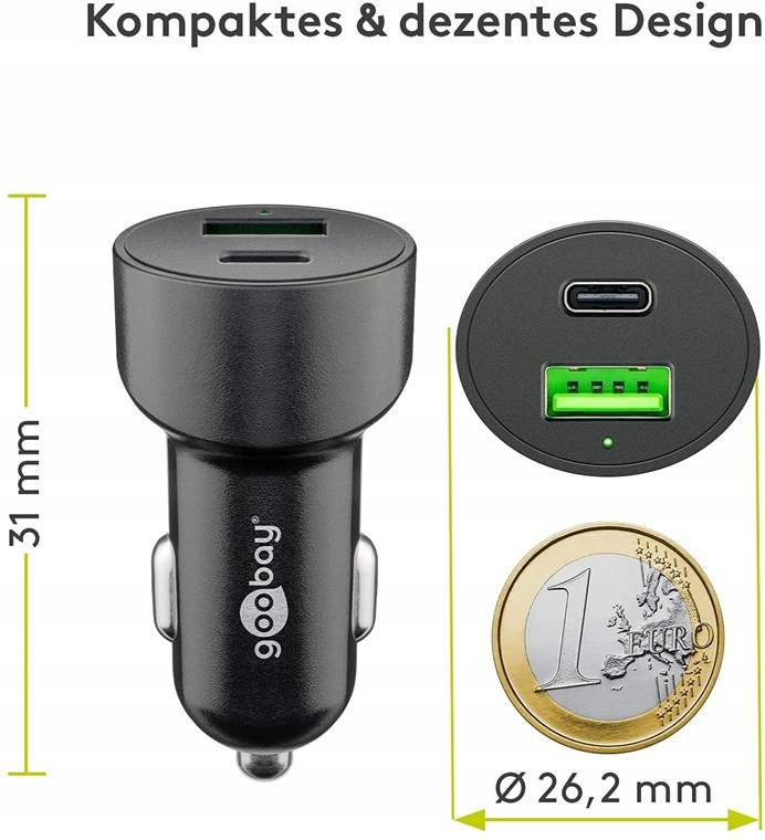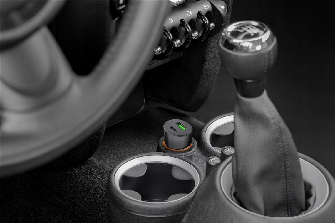 - Зарядний пристрій у міні-форматі заряджає два пристрої одночасно від прикурювача через USB-A або USB-C™.