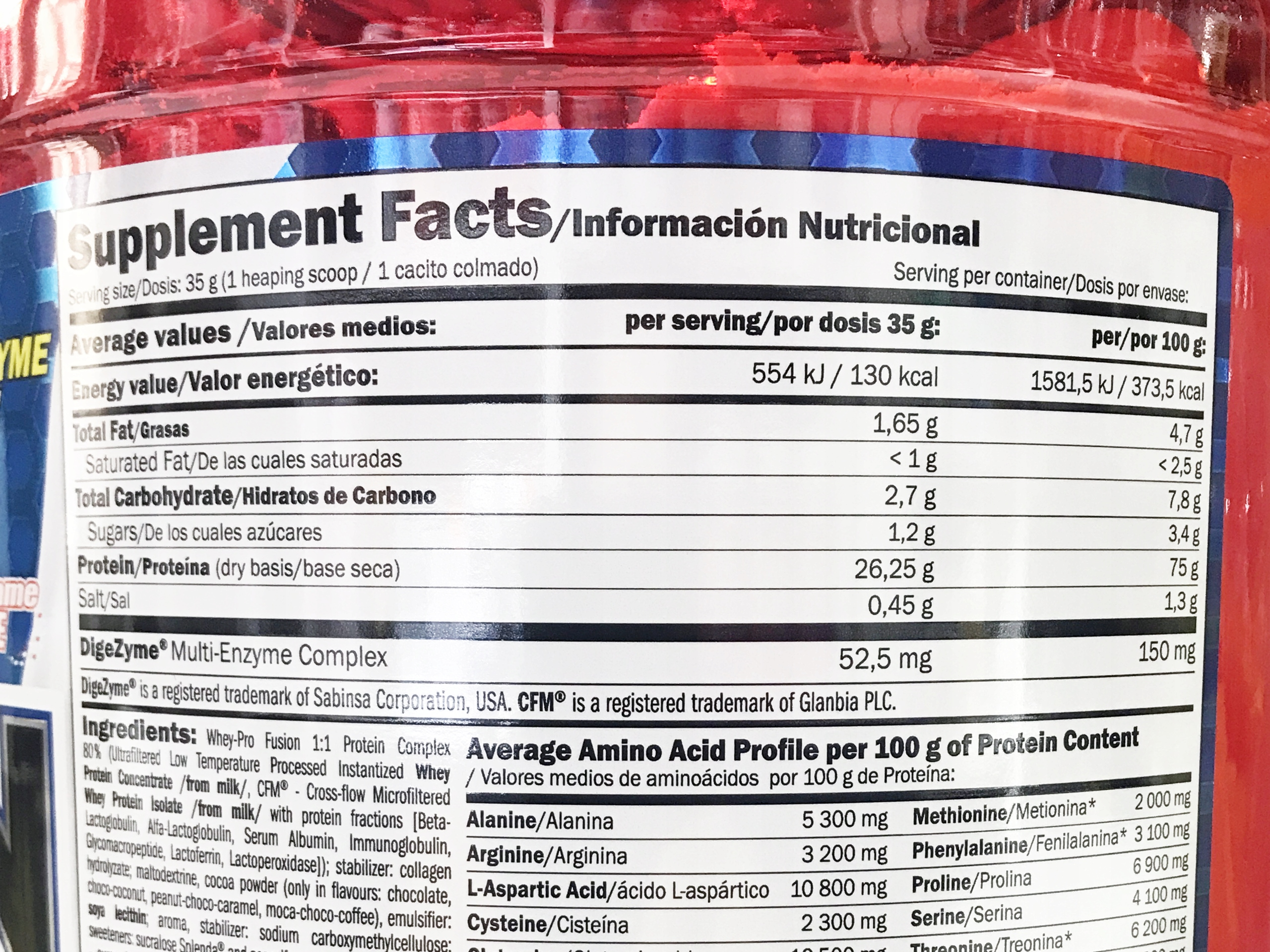 Інгредієнти: премікс Amix™ FUSION (ультрафільтрований концентрат сироваткового протеїну, оброблений при низькій температурі, CFM - мікрофільтрований ізолят сироваткового білка з перехресним потоком із білковими фракціями: бета-лактоглобулін, альфа-лактоглобулін, бичачий сироватковий альбумін , Імуноглобулін, Глікомакропептид, Лактоферин, Лактопероксидаза), какао-порошок (тільки зі смаком шоколаду), мальтодекстрин, стабілізатори ксантан і гуарова камедь, соєвий лецитин, натуральний і ідентичний природному ароматизатор, підсолоджувачі: сукралоза Splenda® і ацесульфам-К, барвник: (банан ароматизатор - куркумін, смак полуниці та лісових фруктів - екстракт буряка, яблуко та кориця - тартразин і патентований синій V), запатентований травний фермент DigeZyme® - мультиферментний комплекс (амілаза, ліпаза, лактаза, целюлаза, бактеріальна нейтральна протеаза)
