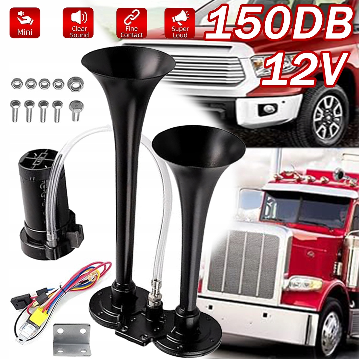 ⭐ ⭐ ⭐, рог вантажівки може видавати гучний і шокуючий звук, який випромінює попередження, яке неможливо ігнорувати і робить водіння безпечнішим. Тільки для вантажних автомобілів/автомобілів з водопостачанням, без подачі газу, ви не можете встановлювати мотоцикли, пасажирські автомобілі, позашляховики тощо
