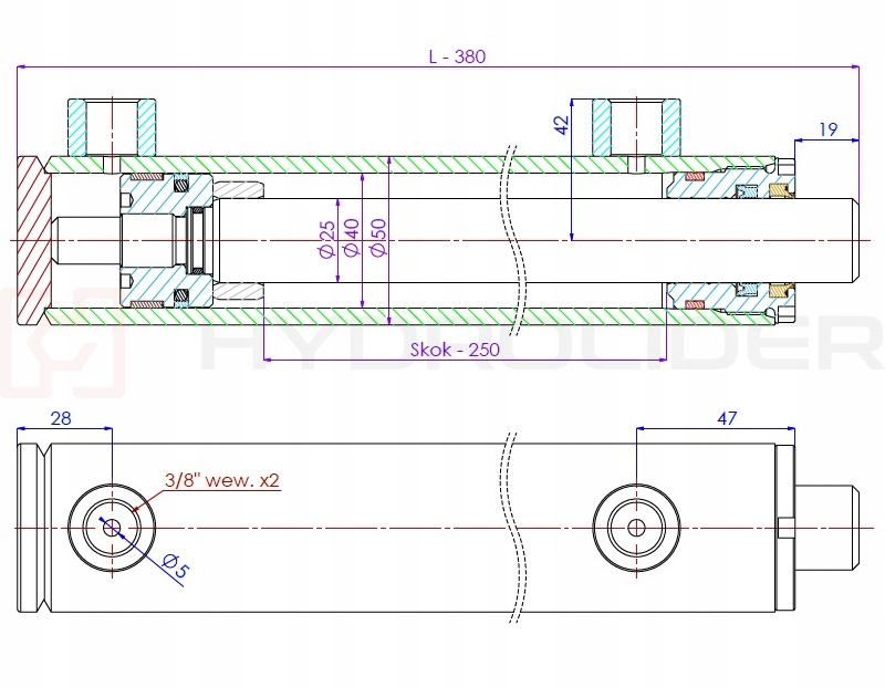 Подвійний гідравлічний привід L: 380 мм стрибок: 250 мм 40/25/250