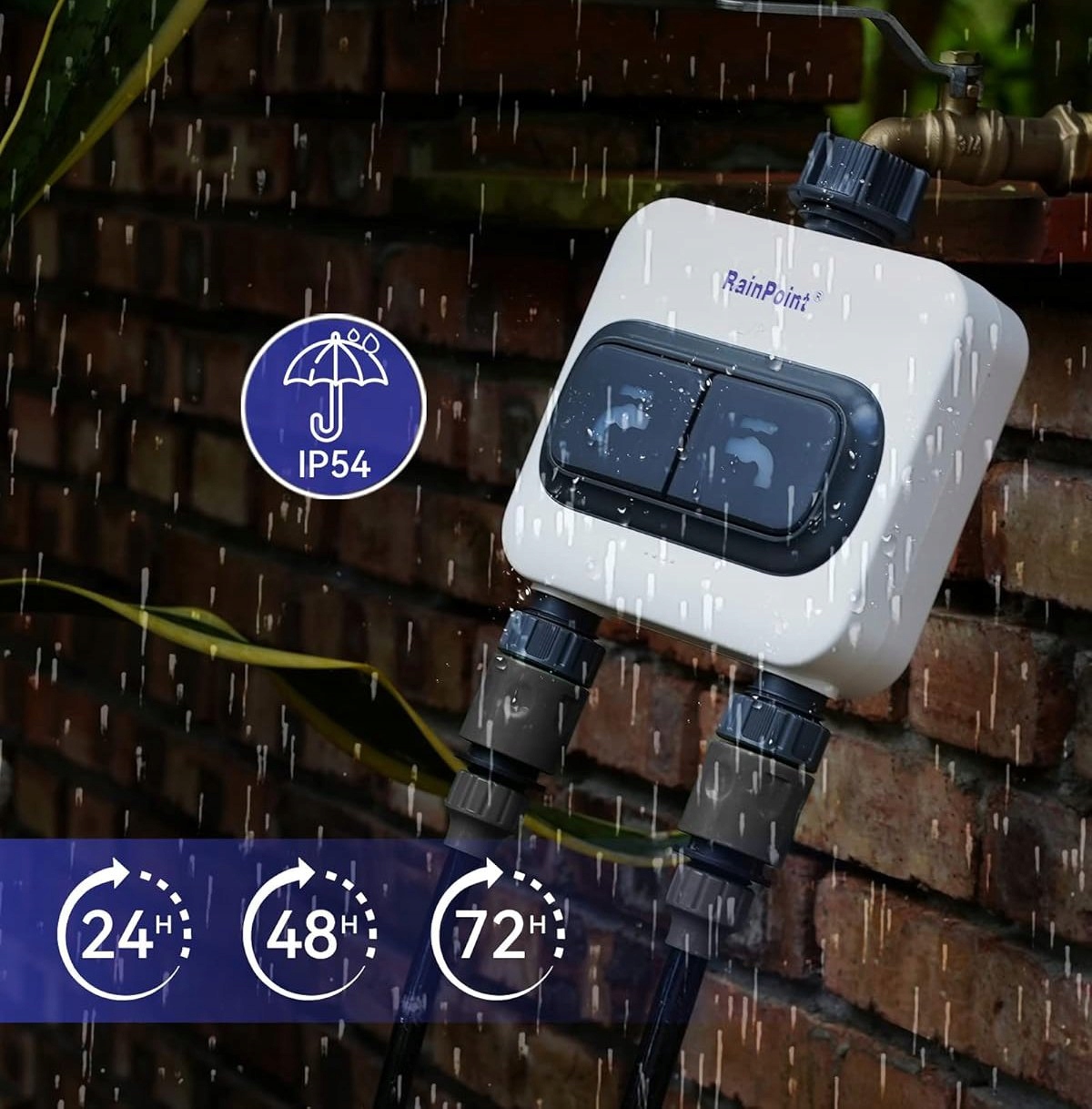 RainPoint Smart+ - це інтелектуальна система зрошення, яка інтегрує контролер зрошення, лічильник води, датчик ґрунту та сонячне світло, датчик ґрунту та сонячне світло, дощовий лічильник та зовнішній термометр. Завдяки Rainpoint Smart+ Ви можете автоматизувати всю систему зрошення та отримати точну інформацію про погоду як у додатку, так і через метеостанцію. Матожина Автоматизувати зрошення та стежити за погодними умовами з будь -якого місця!