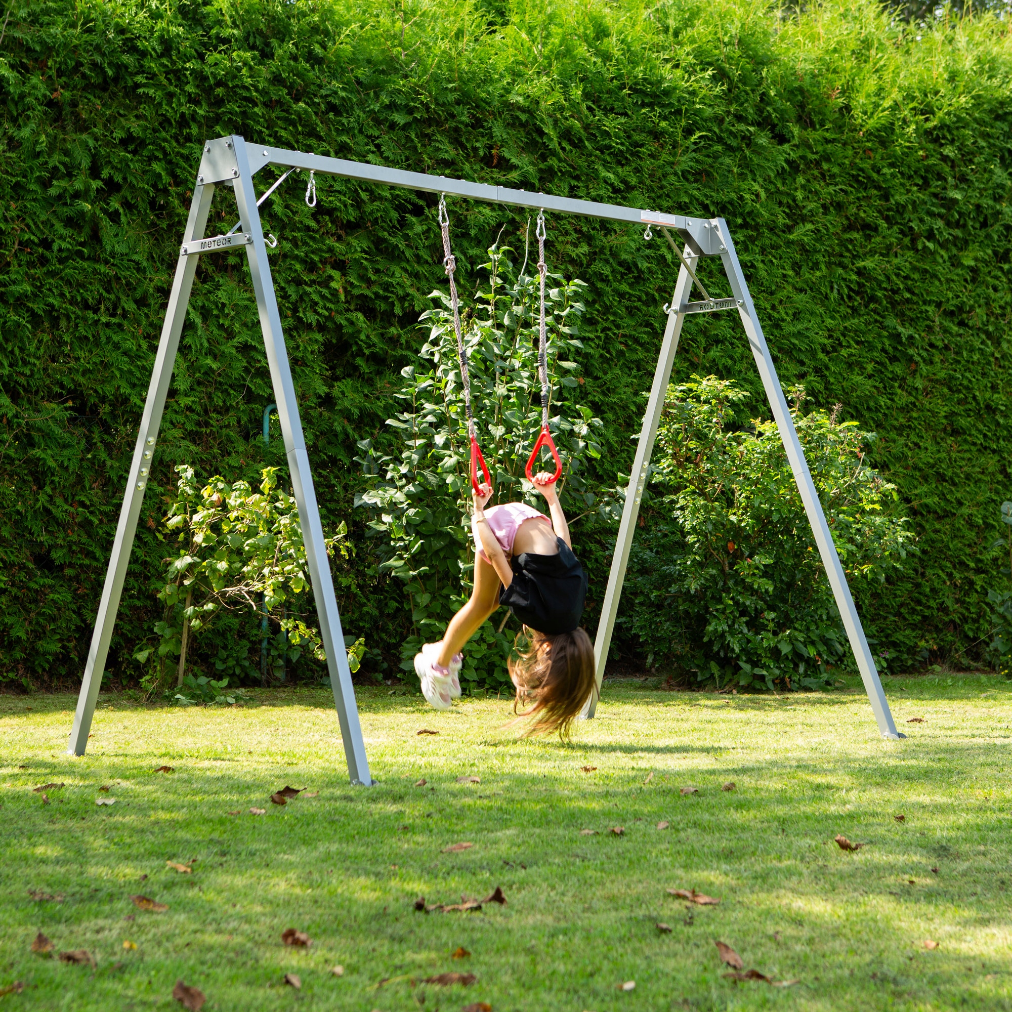 Конструкція адаптована для встановлення та використання двох обладнання одночасно, наприклад 2 гойдалки або гойдалки та лелего гнізда тощо (не включені). Кадр призначений для зовнішнього використання. Це вимагає гвинтового повороту і стабільного кріплення до землі. Це дозволено рухати ногами з отворами, розміщеними на кінцях рамкових ніг. Залежно від типу підкладки (бетон, трава), стопи можна встановити за допомогою якорів, прикріплених до набору, або гвинтів або розширювальних пробки (не включені).