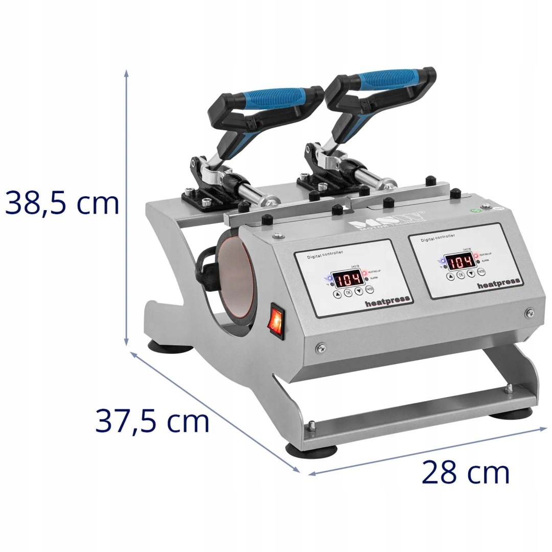 Термоперенесення прес для кухлів MSWз двома незалежно керованими, але підключеними камерами тиску та різноманітними можливостями, він стане ідеальним вибором для творчих проектів і продуктів. З його допомогою ви можете одночасно наносити відбитки на дві чашки (приблизно 11 / 300 мл). Машину можна використовувати для дизайну рекламної продукції тощо. Тому він чудово підійде для любителів і професійних друкарів. Печатка гарантує точне перенесення графіки на різні предмети, наприклад, чашки, кухлі, склянки, пляшки та багато іншого. Завдяки точним датчикам, рівномірному розподілу тепла та цифровому рідкокристалічному дисплею прес забезпечить найвищий рівень контролю. Встановлення температури в діапазоні 0 - 250°C гарантує, що мотиви будуть перенесені на матеріали з найвищою точністю. Цифровий РК-дисплей полегшить вибір і контроль робочих параметрів. Для ще більшого комфорту та безпеки прес має таймер, який можна встановити від 0 до 17 хвилин. Будильник повідомить вас, коли процес буде завершено. Вбудований захист від перегріву забезпечує додатковий захист пристрою та матеріалу. Це запобіжить нагріванню нагрівальних елементів до занадто високих температур і забезпечить безпечне використання. На відміну від інших моделей, цей прес-підбирач займе мало місця. Це робить його ідеальним вибором для використання в невеликих копіювальних машинах або студіях-хобі.