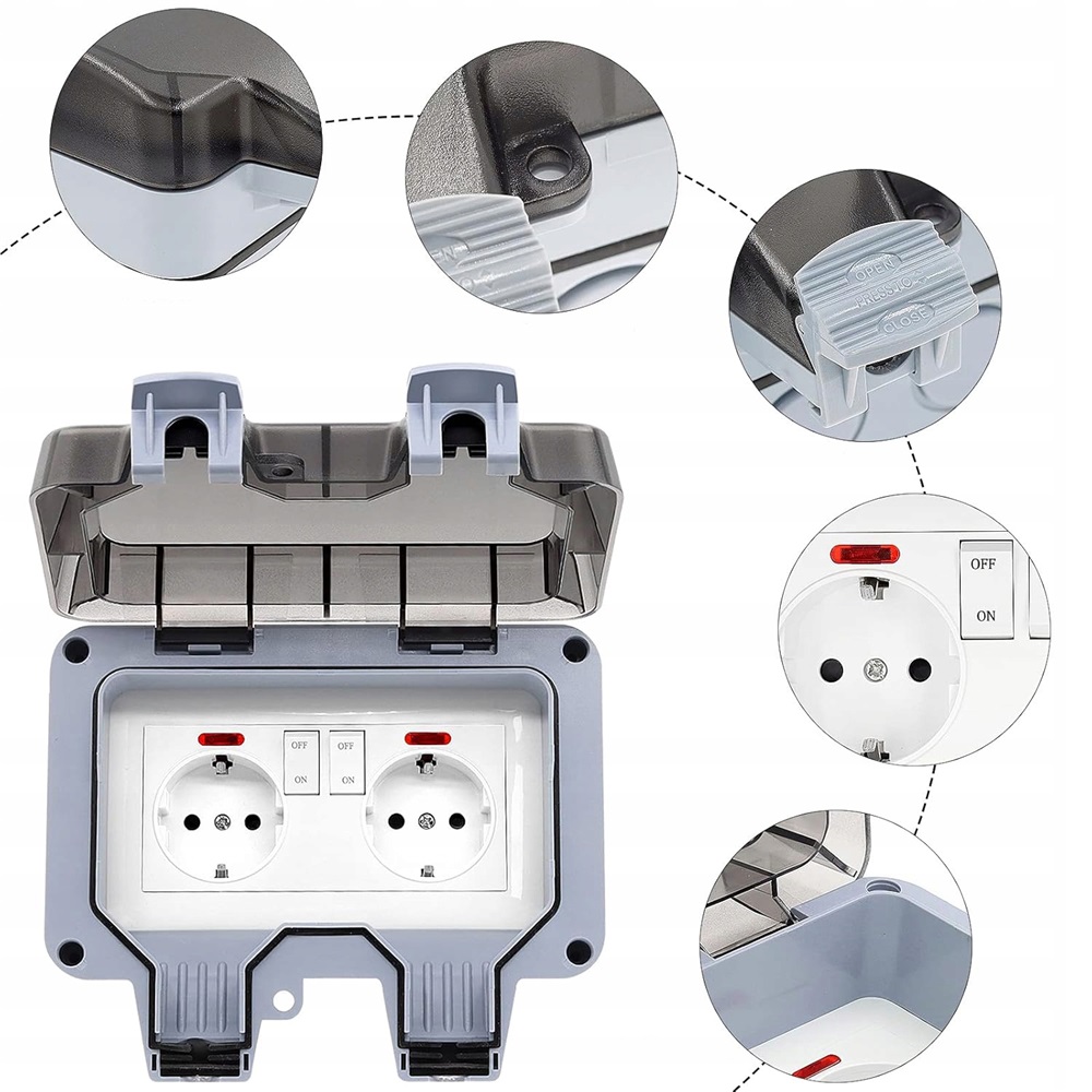 Водонепроникна подвійна розетка має окремий перемикач, контрольну лампу та закриту кришку для запобігання випадкового відкриття та захисту дітей. Два шари гумових кілець запобігають потраплянню води, перша запобігає проникненню дощової води у внутрішню частину, а другий захищає внутрішню частину від пошкодження дощової води. 3,3 см піднята будівництво для кращого осушення дощової води.