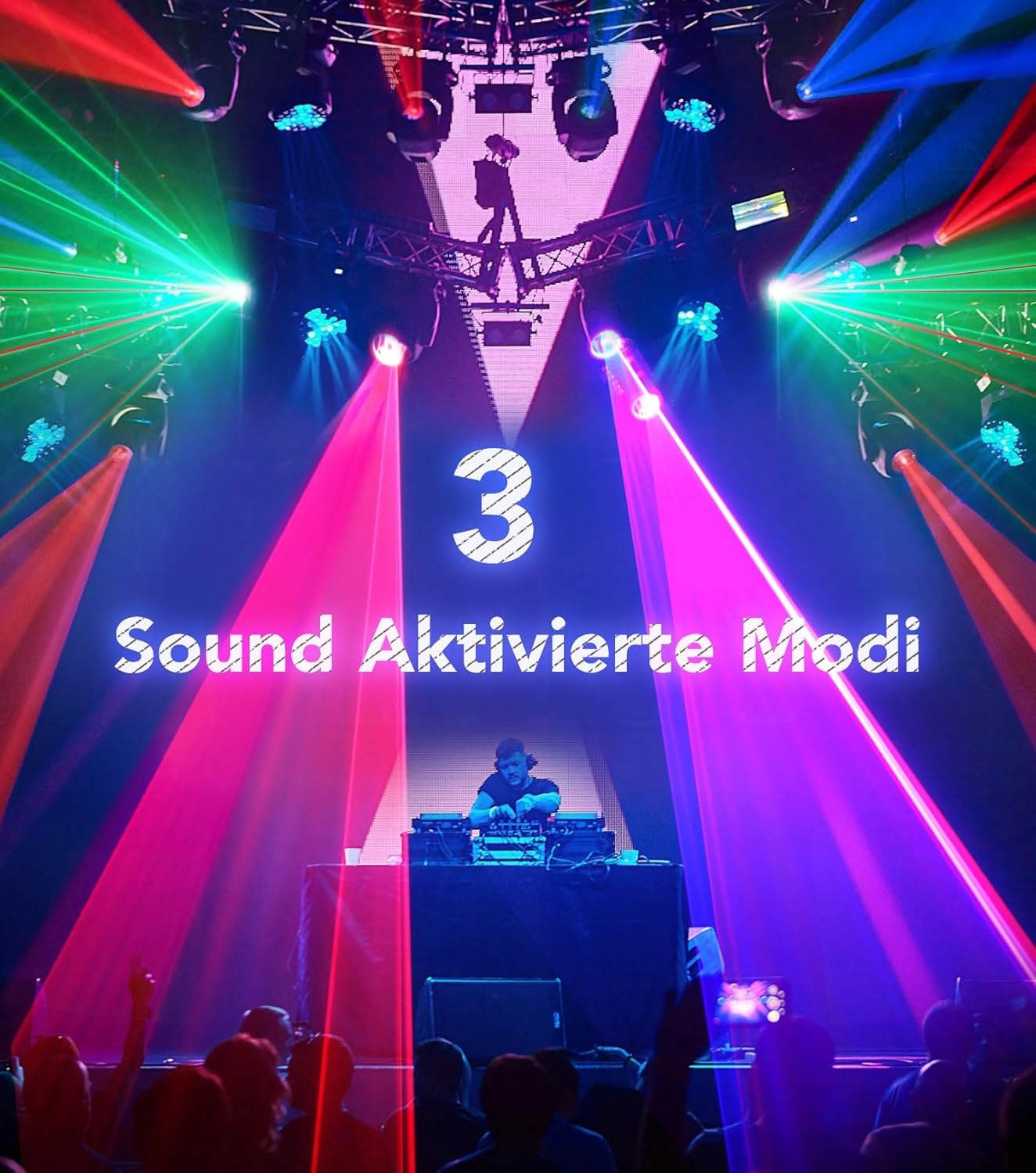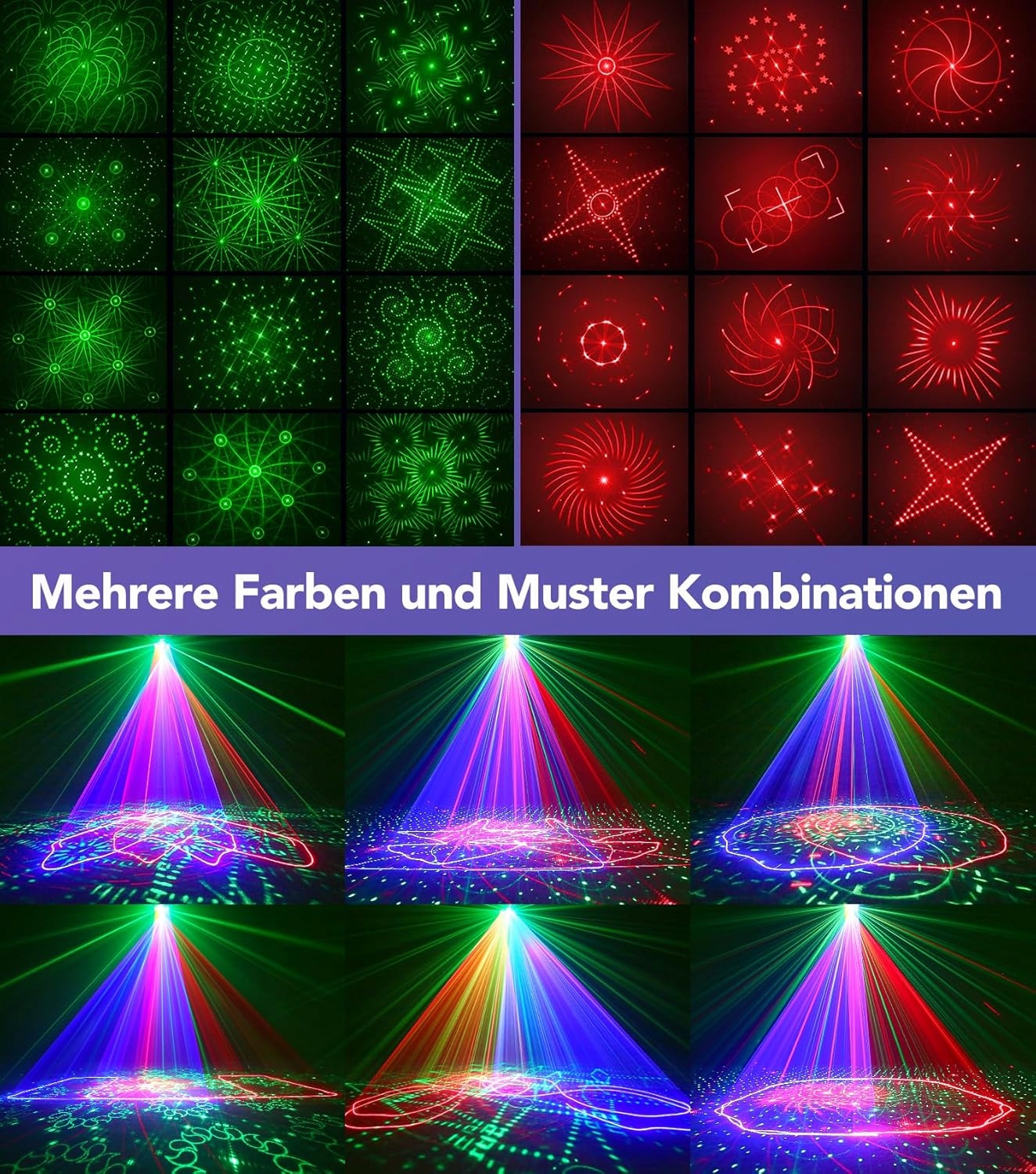 【Дискотечне світло 5 в 1】Дискотечне світло 5 в 1 поєднує в собі динамічні візерунки, потокову графіку, світлодіоди RGB, УФ і стробоскоп. Ді-джейські диско-ліхтарі можна створювати з десятками різних комбінацій візерунків. 7 фонових кольорів (червоний, зелений, синій, червоно-зелений, червоний, синій, синьо-зелений, червоно-зелений і синій) і 3 комбінації променів (червоний, синій, червоно-синій), 3 динамічні зіркові ефекти (червоний/зелений/червоно-зелений). Ширина проекційного екрана до 500 квадратних метрів.
