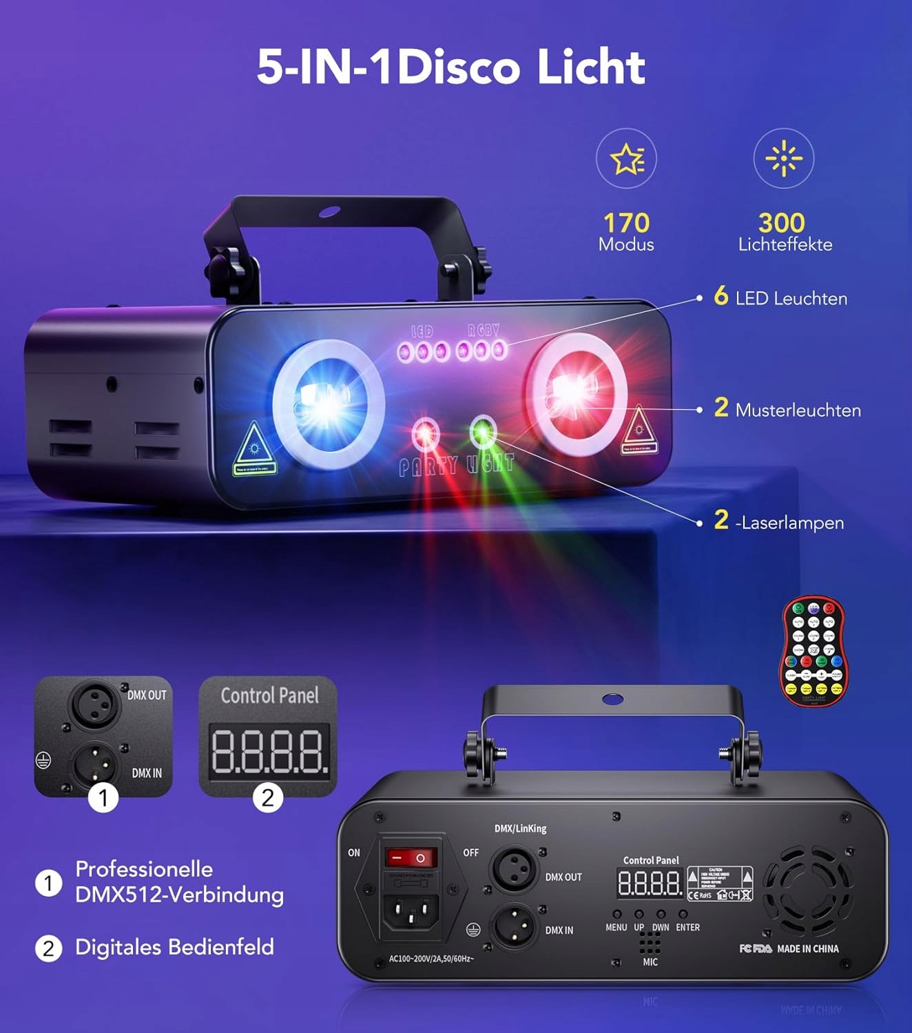 Пульт дистанційного керування та керування музикою та DMX512. Наш пульт дистанційного керування може вмикати/вимикати, автоматичний режим, режим освітлення, колір світлодіода, мерехтіння світлодіода та швидкість обертання диско-світла. Потужні звукові датчики синхронізують світлові шаблони з музичними ритмами або навколишніми звуками. Диско-ліхтар також можна під’єднати до пристрою DMX, який підтримує протокол DMX512 і 18-канальний канал.